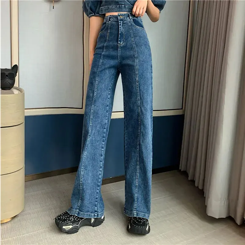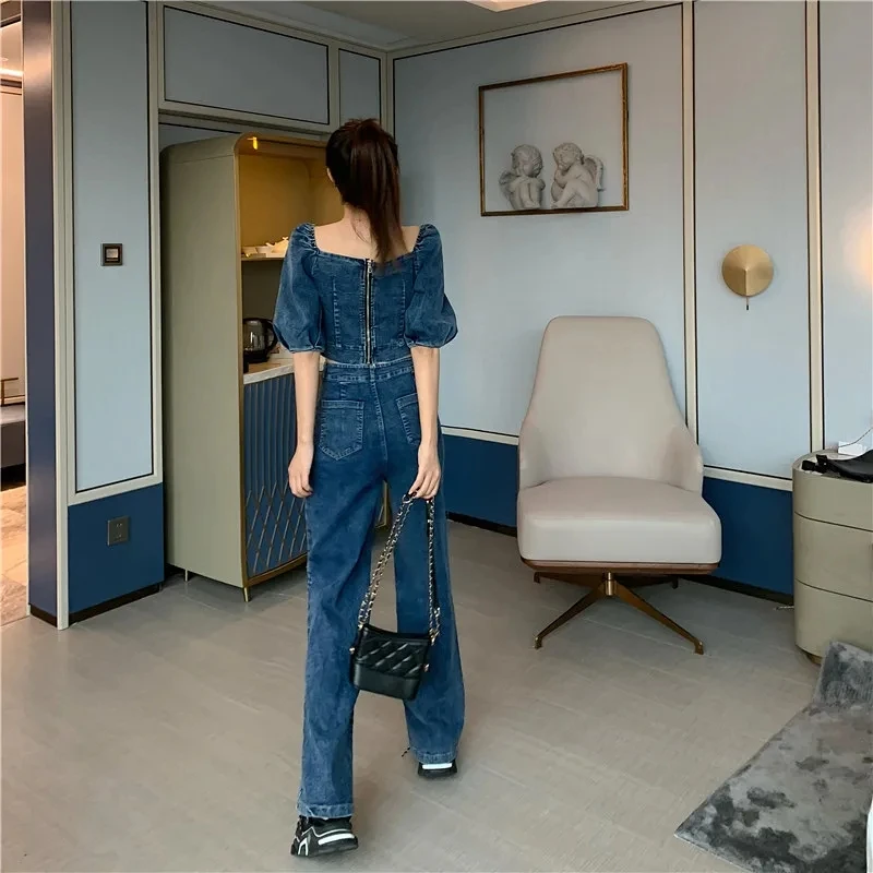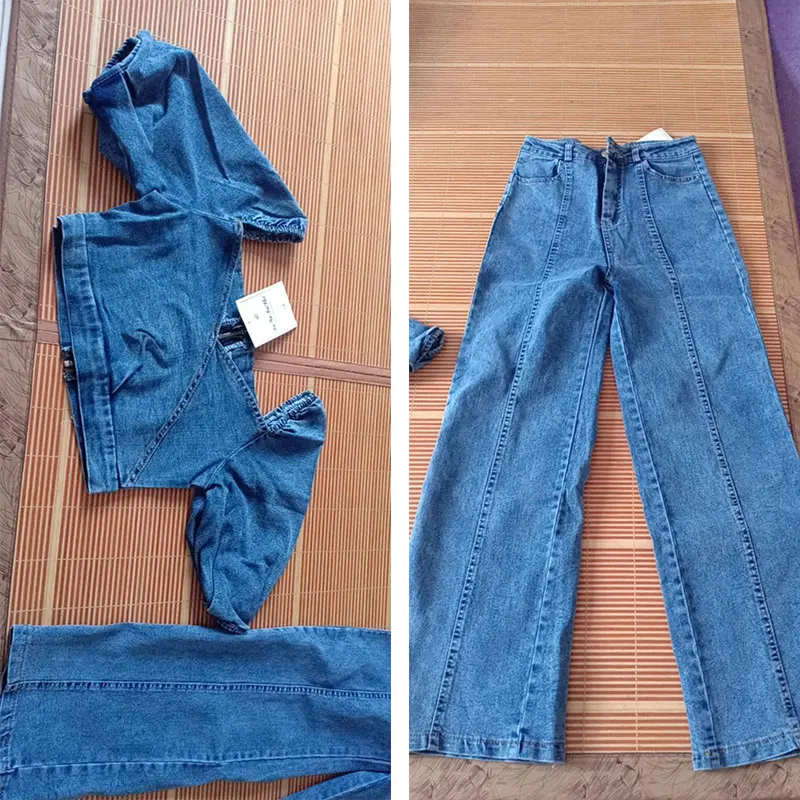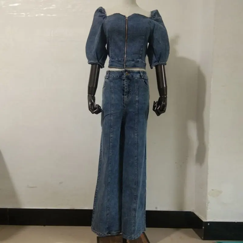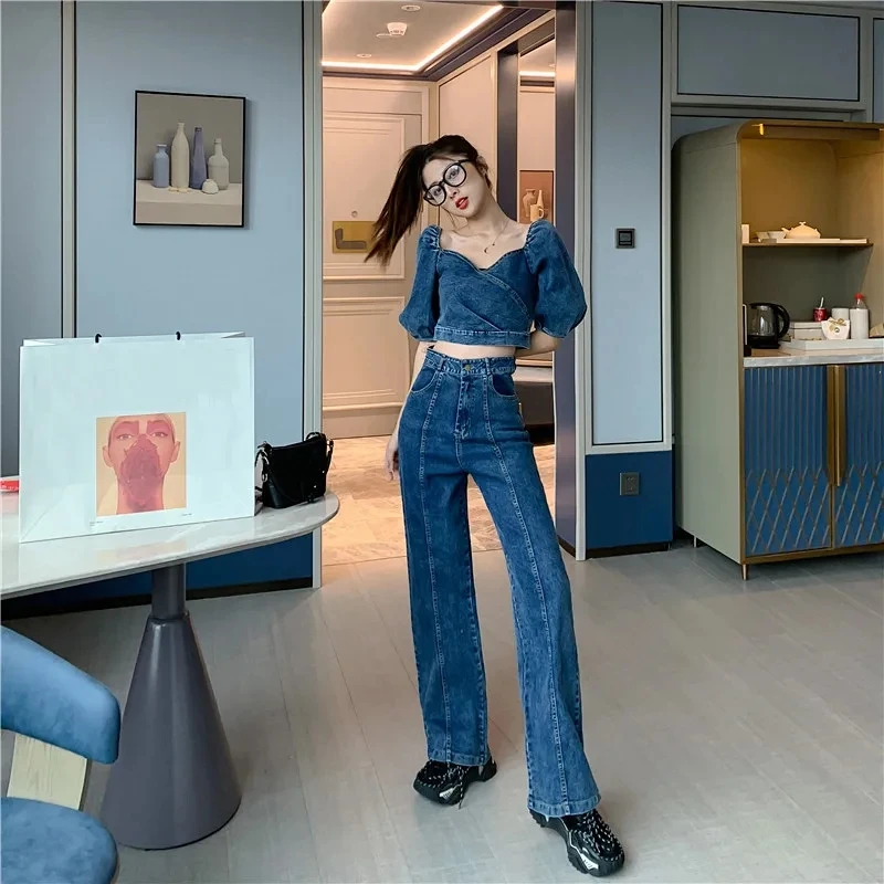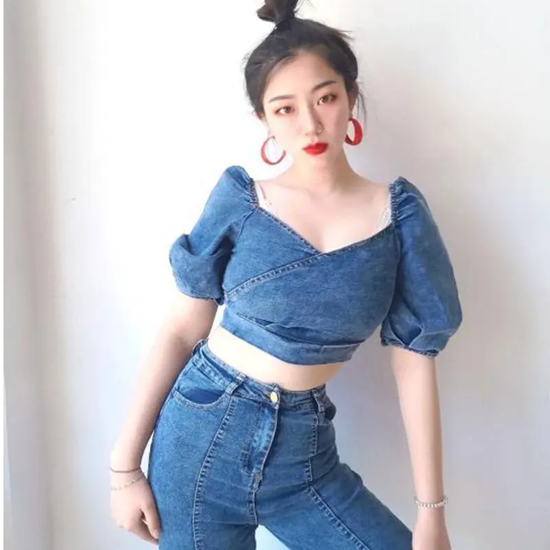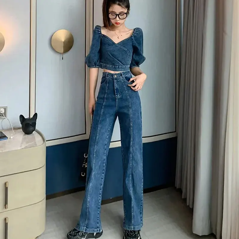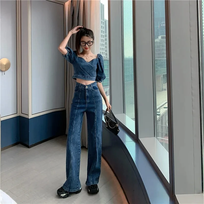 Комплект из двух предметов женский джинсовый, модный пикантный короткий топ с V-образным вырезом и рукавами-фонариками и джинсовые Широкие штаны с завышенной талией, весна 2021
