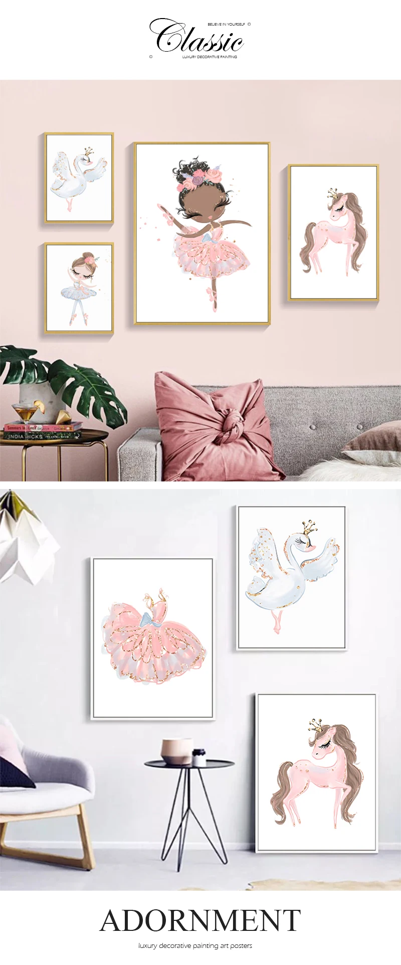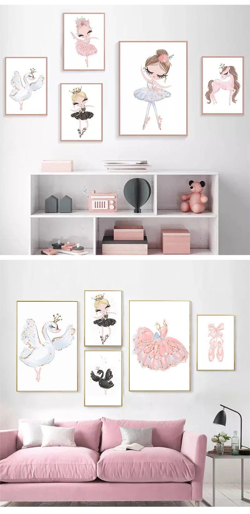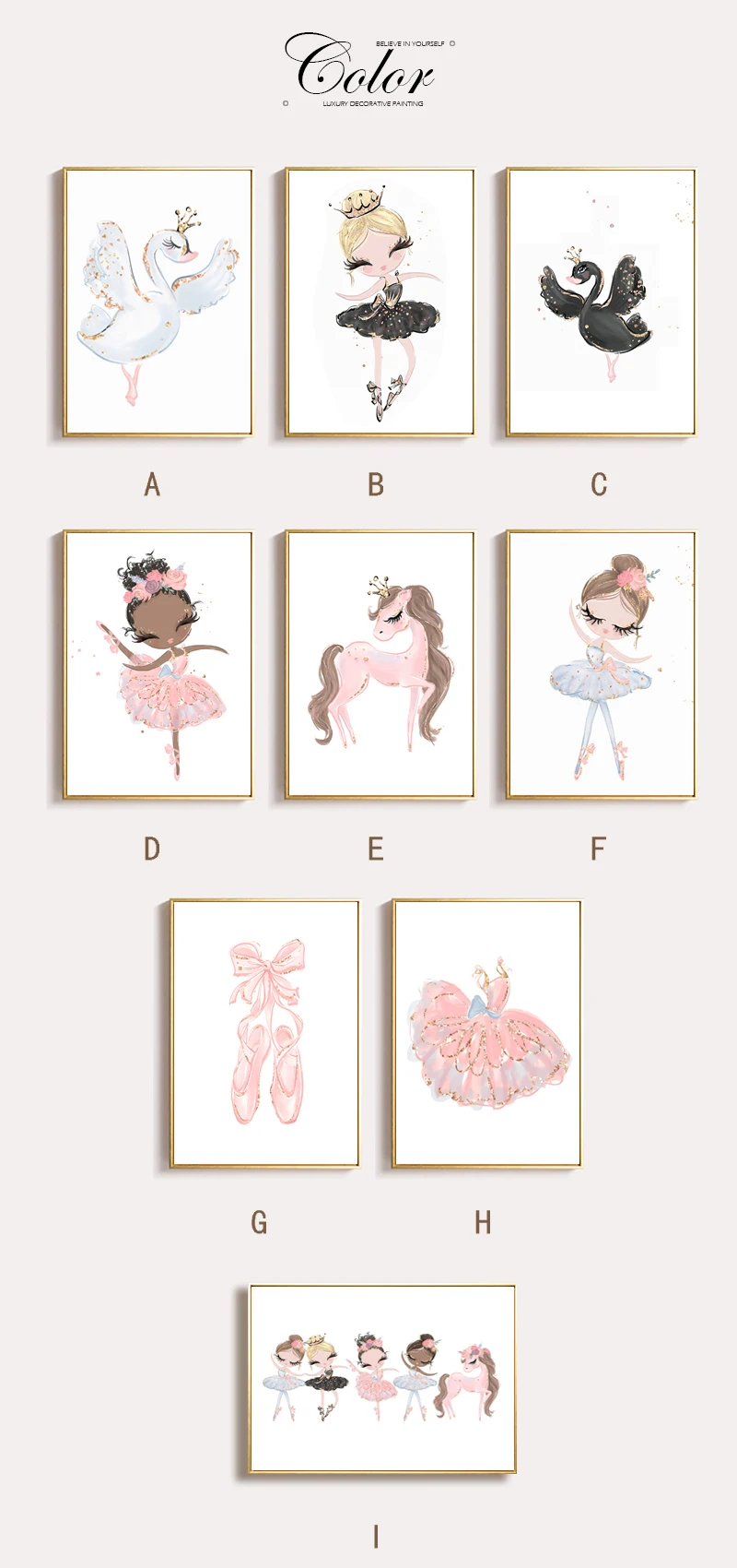 Плакаты и принты для детской комнаты, танцующая девочка, корона, лебедь, платье, обувь для детей, декор для детской комнаты, гостиной