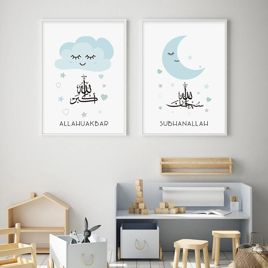 Исламский мультфильм серые облака Звезды Луна плакат для детской хо...
