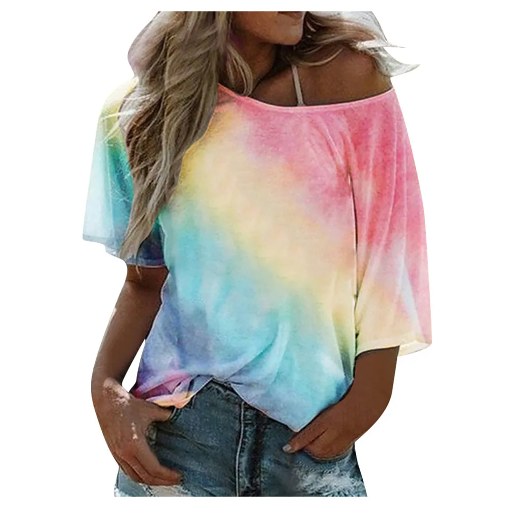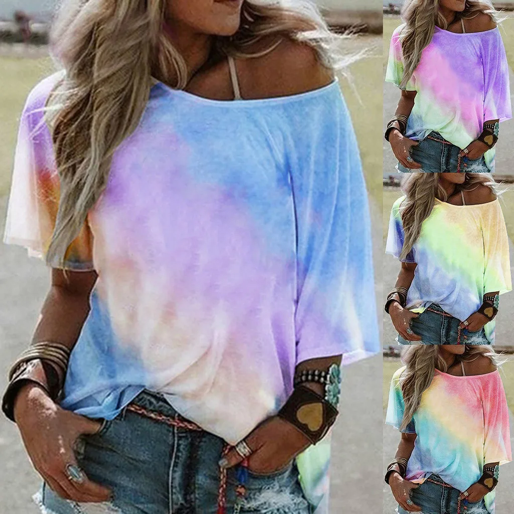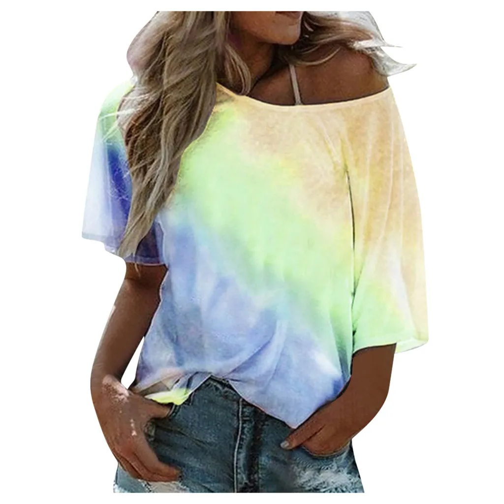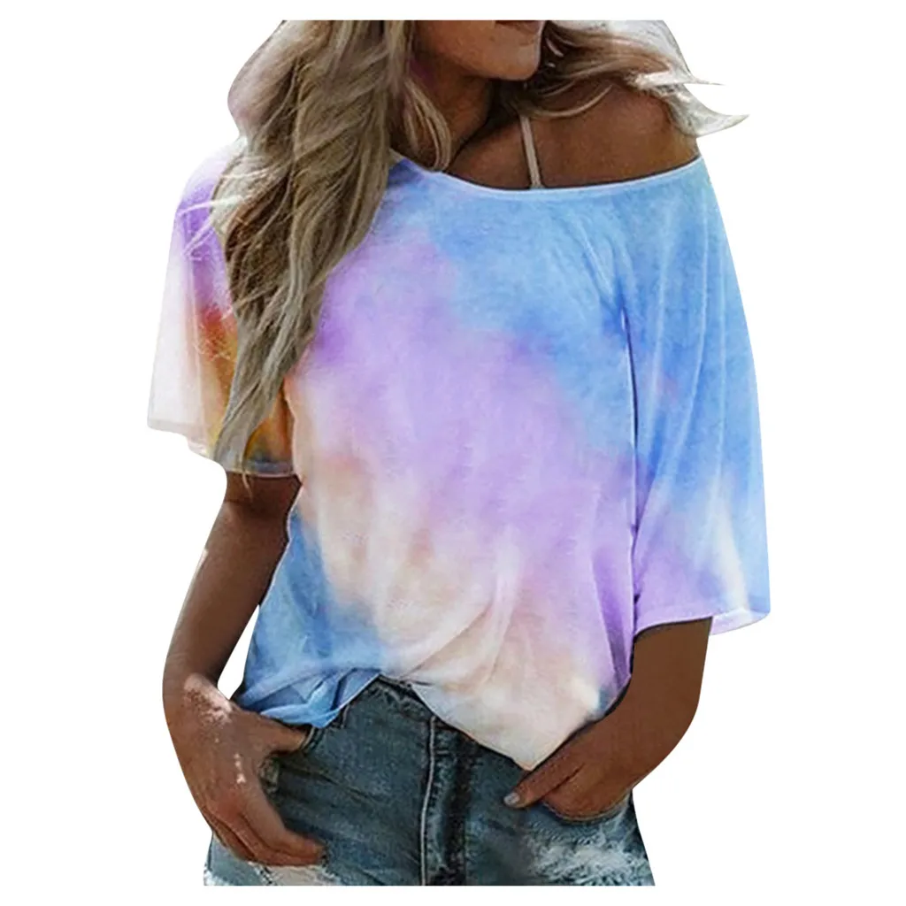 Футболка женская с принтом тай-дай, свободная модная уличная рубашка с открытыми плечами, одежда для женщин на лето