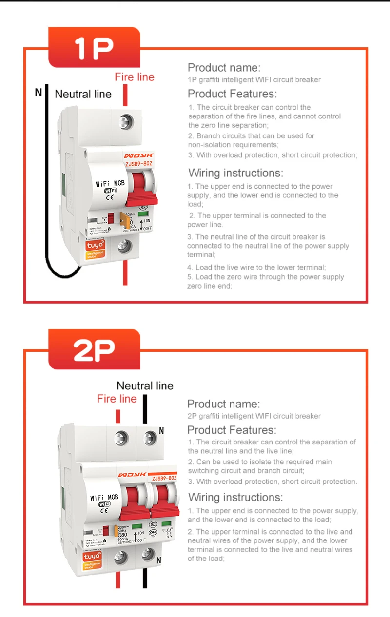 Автоматический выключатель остаточного тока Smart Home 1P + N с переключателем защиты от перегрузки и утечки тока с Alexa Google Home