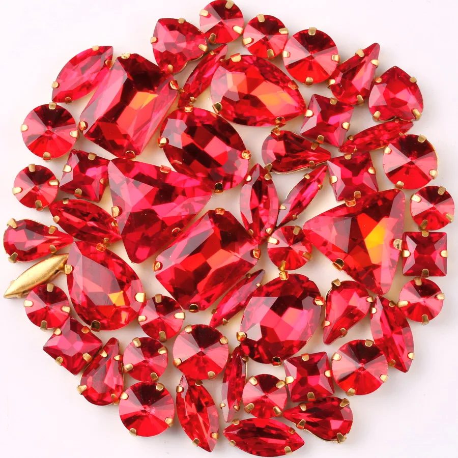 Закрепка с золотыми когтями, 50 шт.пакет форм, Микс красных стеклянных кристаллов, стразы для пришивания, сумки для свадебного платья, обуви, самодельная отделка