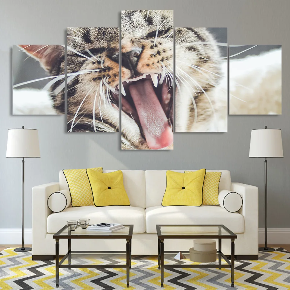 Картина на холсте, Современное украшение для гостиной, 5 панелей, кот с большим ртом, настенное искусство, модульная рамка, фотопостер