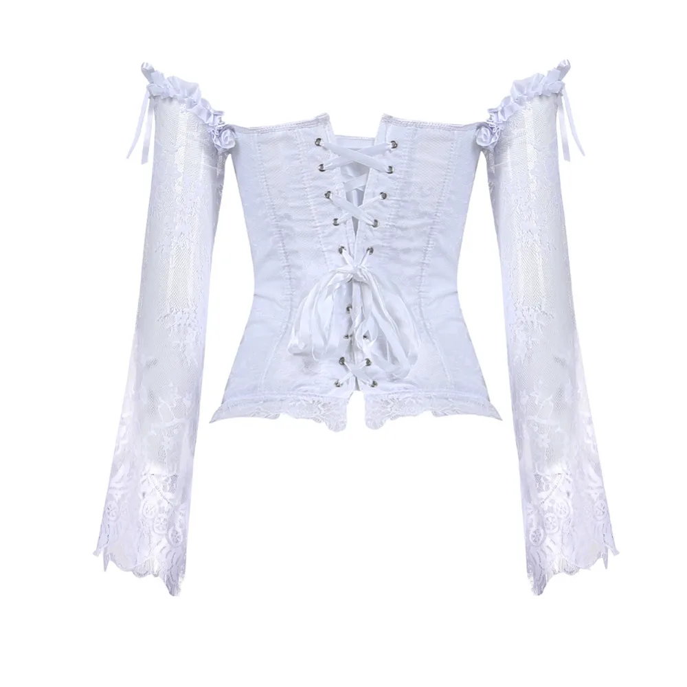 Характеристики:Цвет: белый и черныйСтиль: Сексуальный Кружевной Корсет для невестыМатериал: полиэстер и спандексДлина рукава: длинный кружевной рукавОтлично подходит для свадьбы, выпускного вечера, танцевального представления, костюмированной вечеринки на Хэллоуин и модного шоуПосылка включает:1 * Женский корсет