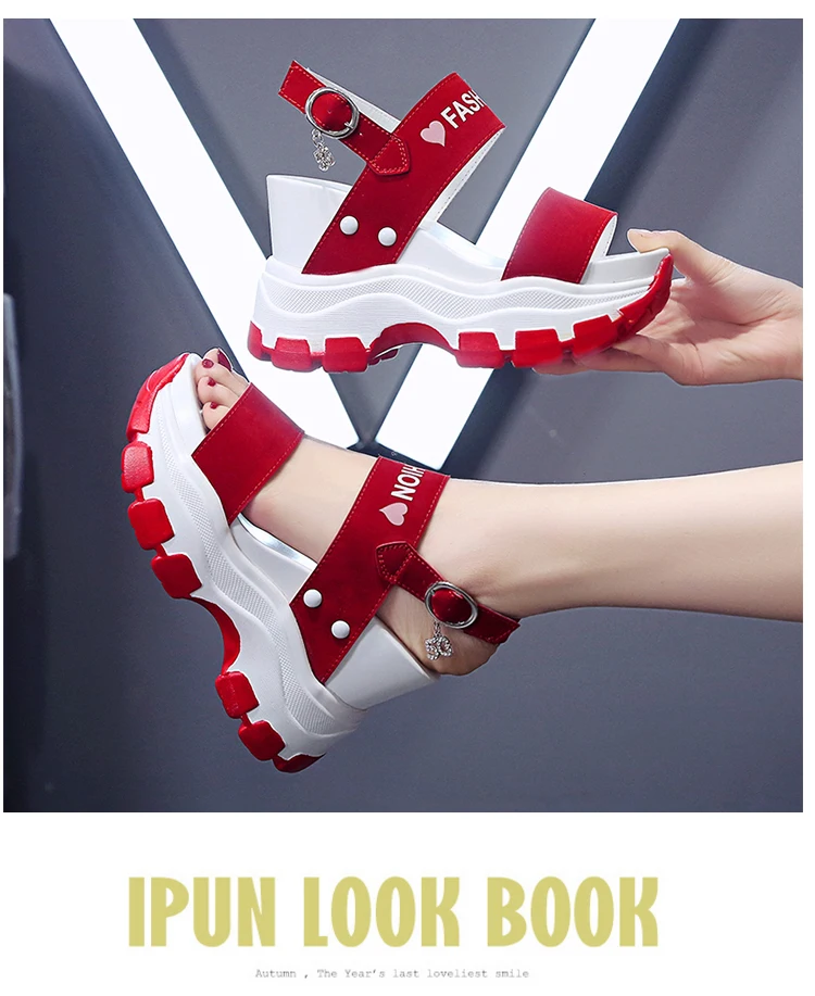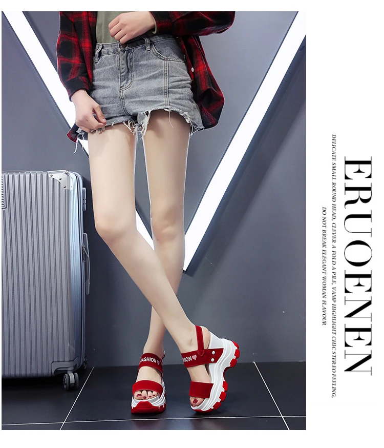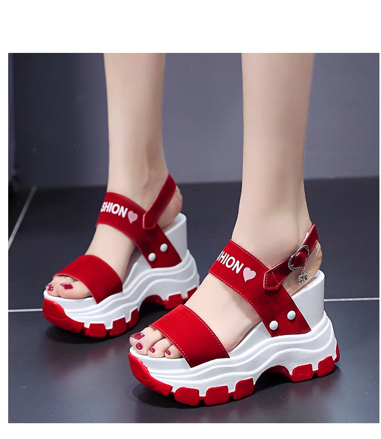 Женские босоножки на платформе, красные сандалии на высокой массивной танкетке с открытым носком, лето 2022