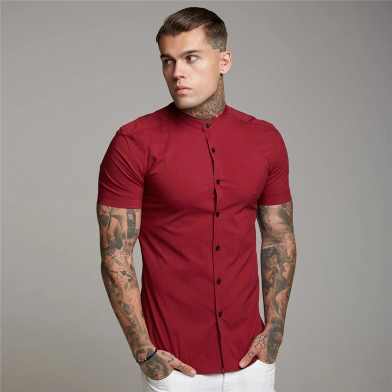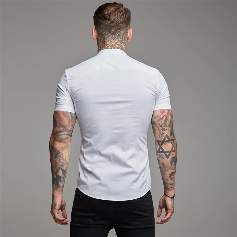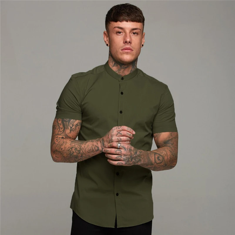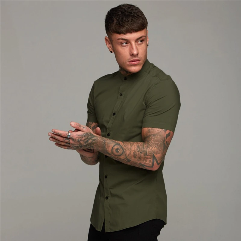 Мужская рубашка с коротким рукавом, летняя однотонная приталенная рубашка в деловом стиле, для тренажерного зала, фитнеса