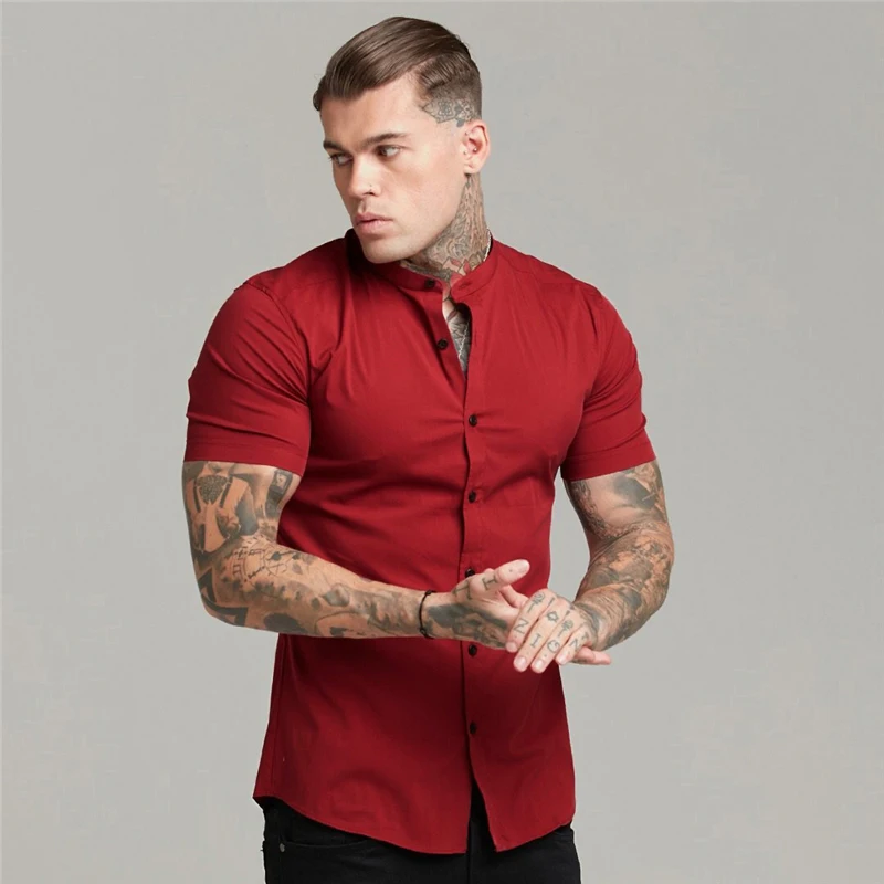 Рубашка мужская однотонная с коротким рукавом, воротником-стойкой и пуговицами