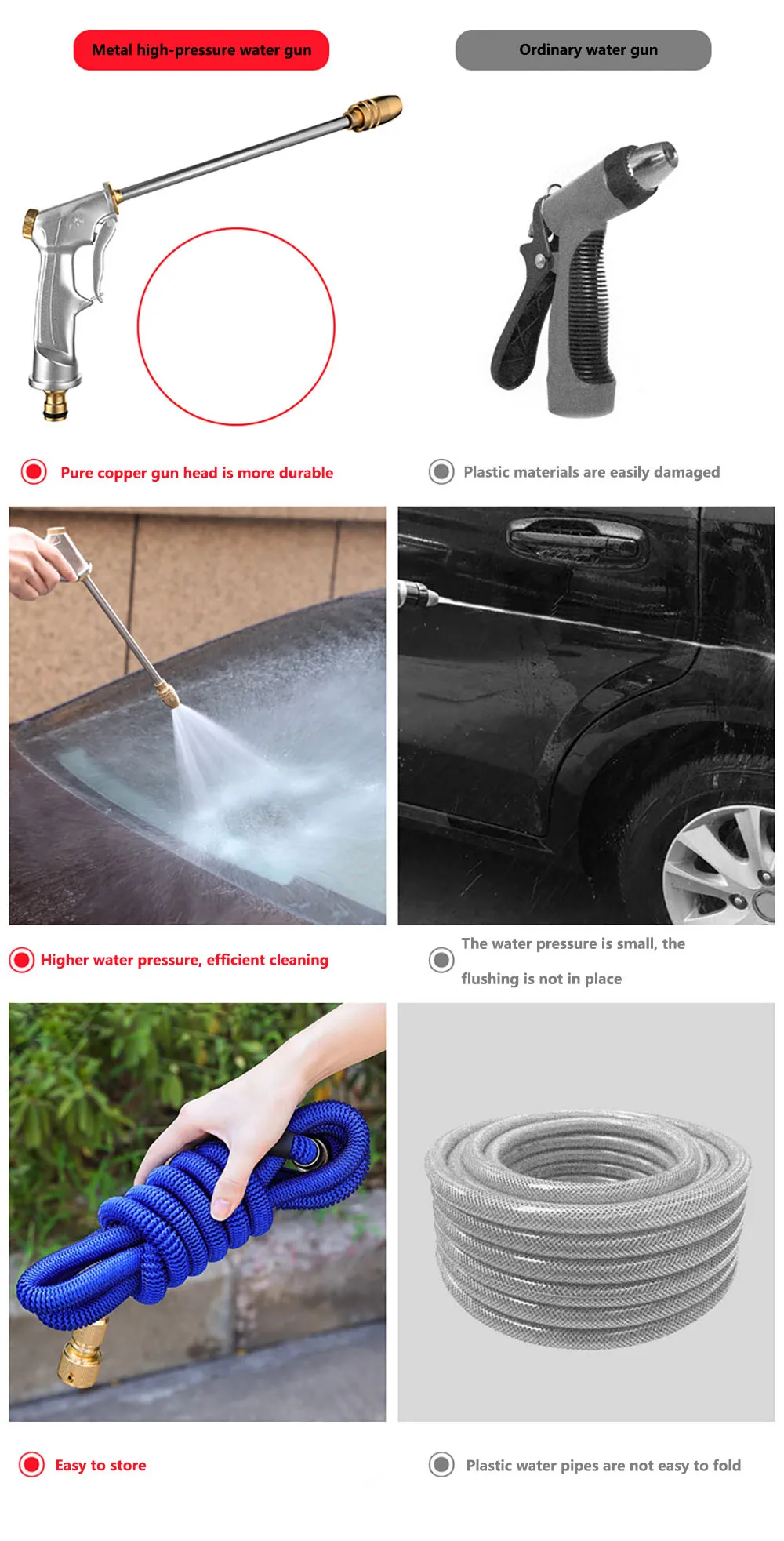 Название: шланг для мытья автомобиля/садовый водяной пистолетМатериал:✦Материал садового шланга: внутренняя труба из ТПЭ, полиэфирная плетеная муфта.✦Материал водяного пистолета: медь, быстрый разъем из сплава, металлический корпус пистолета.Быстрый разъем: 3/4 дюймаСадовый водяной пистолет Размер:26 см * 14 см (10,2*5,5 дюймов)Садовый водяной шланг Размер:7,5 m (25FT): оригинальная длина 2,5 метров, и расширение 7,5 м после впрыска воды.15 м (50 футов): оригинальная длина составляет 5 метров, а расширение-15 м после впрыска воды.22 м (75 футов): оригинальная длина составляет 7 метров после впрыска воды, а прямая длина-22 м.30 м (100 футов): после впрыска воды оригинальная длина составляет 10 метров, выпрямление 30 м.