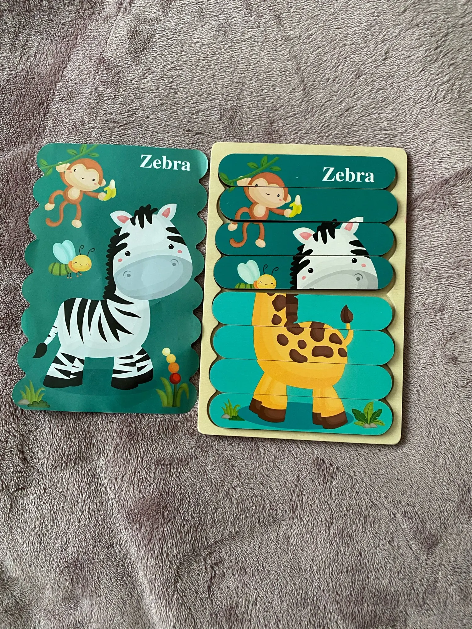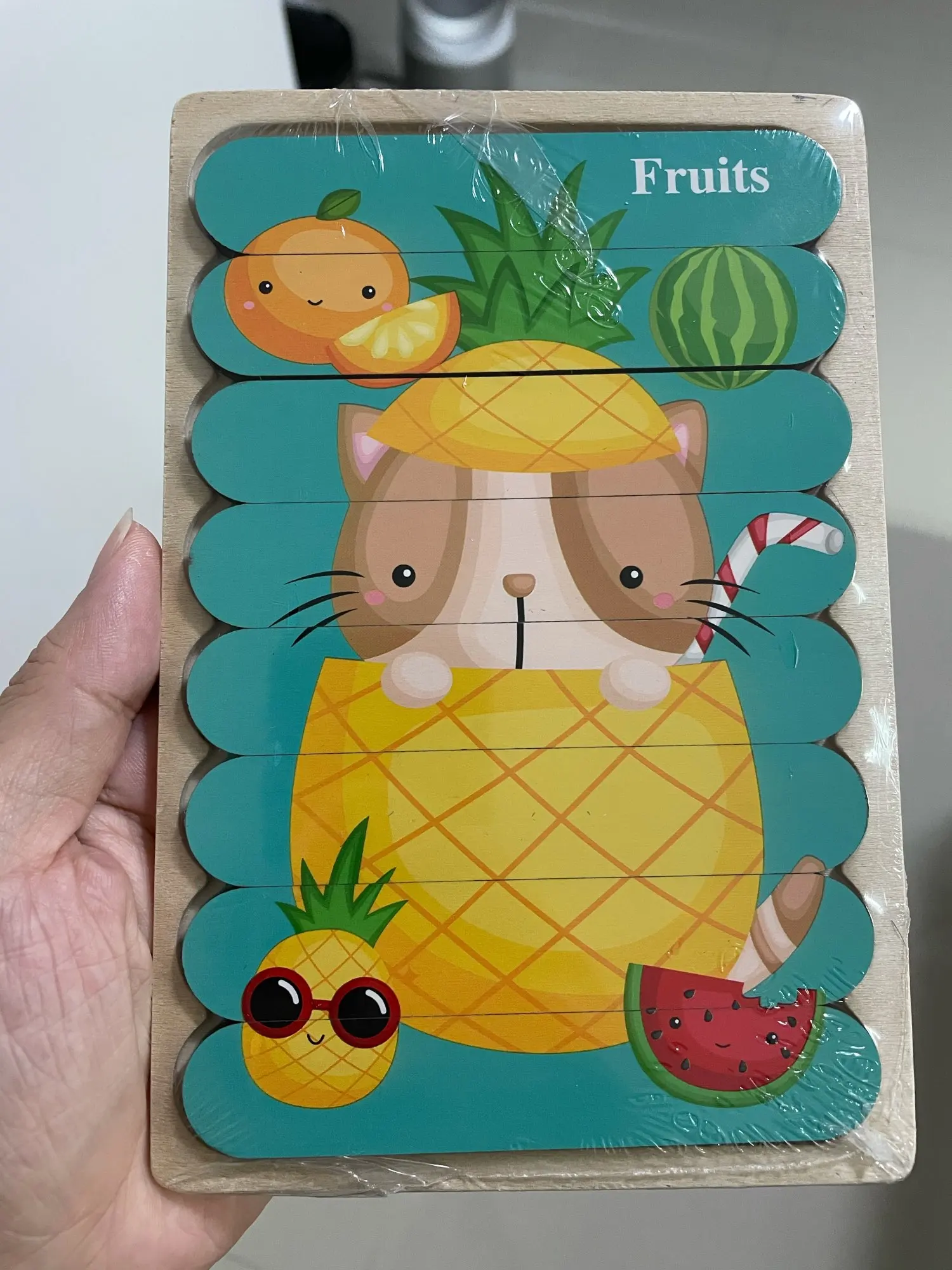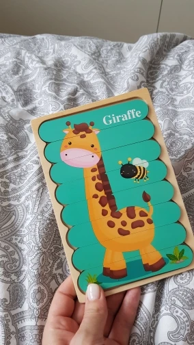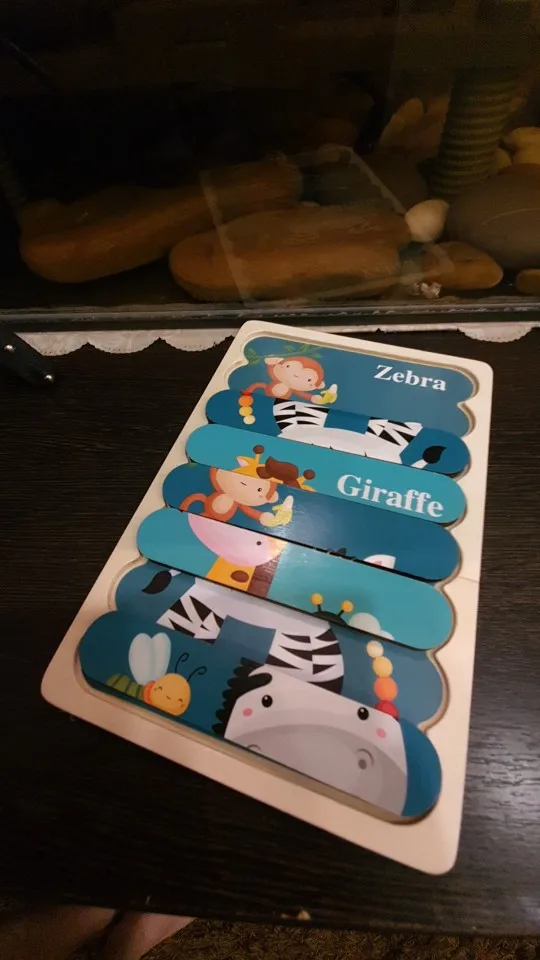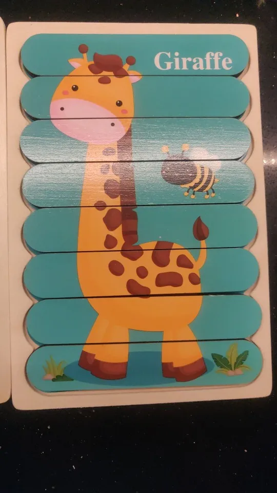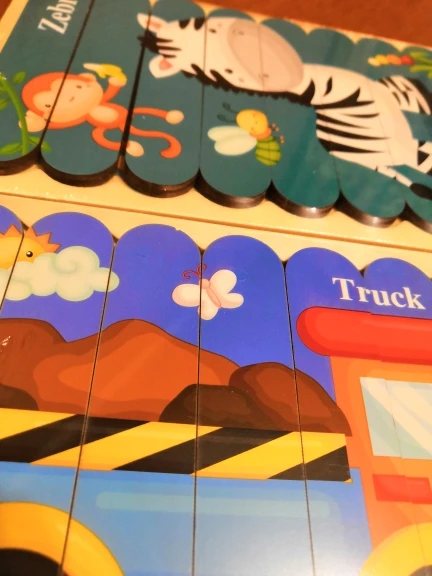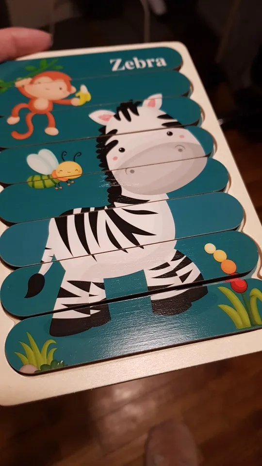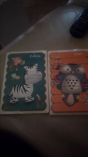 Прикольный пазл для малышей - брала на 2 года. Палочки - обработаны Хорошо. Заусенцев у дерева - нет. Картинка яркая. Приклеена Хорошо. Двухсторонняя.