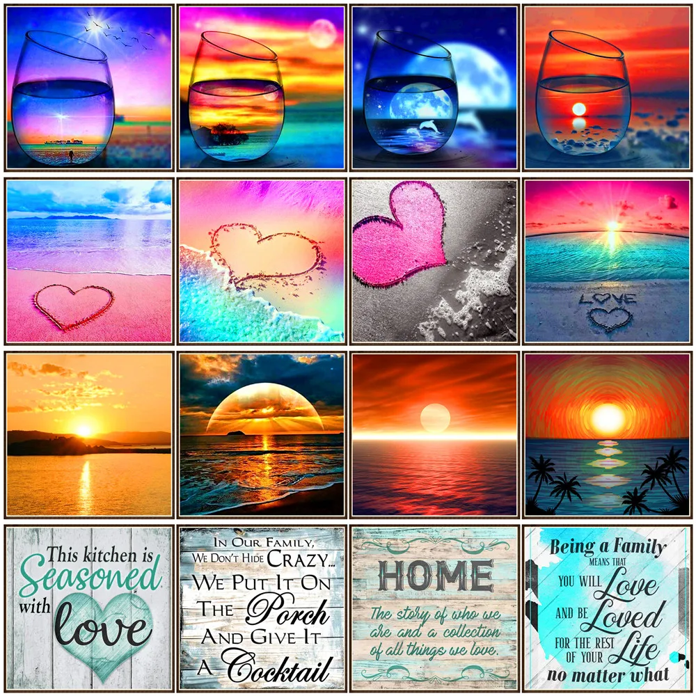 Алмазная 5D картина с пейзажем, круглая, с мотивом морского восхода солнца, пляжа, любви, бокала для вина, букв, для творчества, украшение для алмазной вышивки