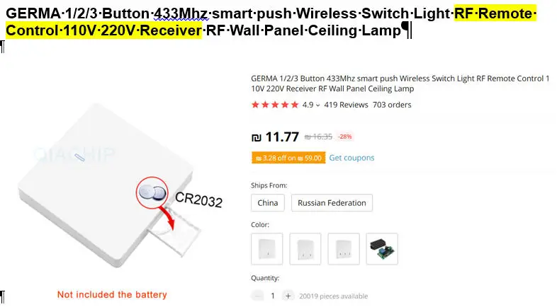 Заказывал доставку платную доставку из России. Пришло за 5 дней. Предыдущий заказ с бесплатной доставкой так и не пришел. Качество хорошее. Батарейку удобно устанавливать. Но, батарейка разряжается быстро. Работает с Sonoff RF R3. Пробовал - пробивает через две кирпичных стены на расстоянии около 15 метров. Для квартиры или дома достаточно. Можно на один модуль Sonoff установить несколько таких выключателе и сделать проходное включение/выключение.