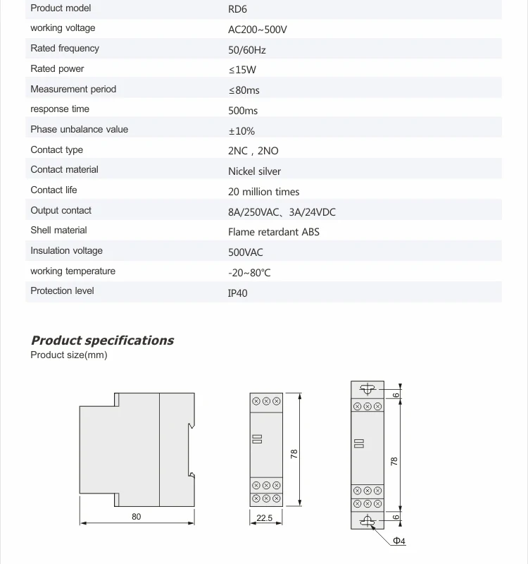 Под/над напряжением, асимметричное контрольное реле RD6Описание:В RD6 DIN крепление мониторинга напряжения тока автомат защити цепи для использования в 3 чередования фаз напряжение и следит за Трехфазная Система AC принадлежности для неправильного чередования фаз, обрыва фазы и фазы Дисбаланс в системах до 500V. В 3-х фазный сети, все стадии параметры, такие как обрыва фазы, чередования фаз, и асимметрия должны отслеживаться, RD6-это ваш лучший выборRD6 обеспечивает защиту фазы и фазы последовательности/сбоя. Используется для того, чтобы обеспечить последовательность верный при подключении 3 фазы нагрузки. С неправильной фазовой последовательностью реле начнет отключать энергию, предотвращая Запуск неправильно подключенного оборудования. Реле также будет работать, если есть Потеря фазы и, следовательно, может использоваться в качестве фазового реле неисправности.Зеленый светодиодный индикатор показывает фазу и горит при правильном направлении вращения.Применение:Cargo грузовые ремни аэропорта.All все типы пассажирских эскалаторов.Passenger пассажирские подъемники и грузовые подъемники. В конвейерных лентах, материал для переноски плоских лент.Industrial контроль промышленного процесса и промышленные трехфазные двигателиGenerator контроль выходной мощности генератора и многое другое.Особенности: C креплением на рейке DIN Обрыва фазы Перекос фаз Неправильного чередования фаз