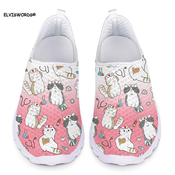 ELVISWORDSмилые женские туфли на плоской подошве с изображением кошки медсестры; Удобные Молодежные Лоферы без шнуровки из сетчатого материала; Сезон весна-лето; Женские кроссовки