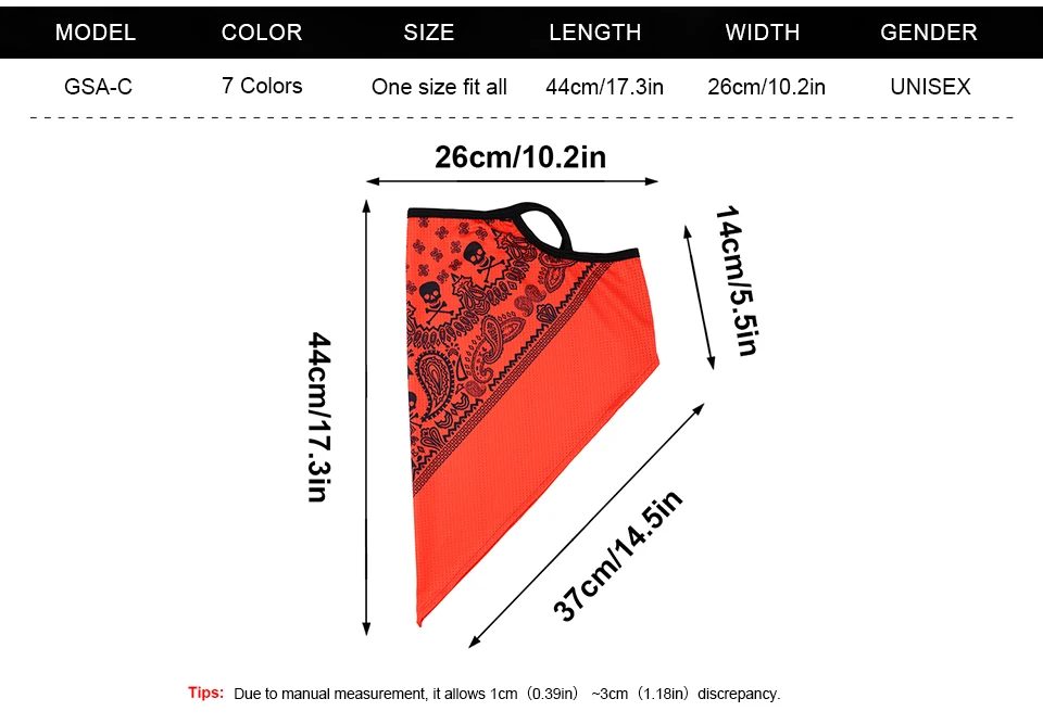 Размер: (один размер) 13 см * 32 смОсобенности:1.Мягкий, не выцветает, высокая эластичность.2.Подвесной Дизайн уха, не легко отвалиться.3.Материал успокаивающий, приятный для кожи и очень легкий.4.Тщательно разработанная ткань защищает вашу кожу от ветра и ультрафиолетовых лучей.Легкий уход:Ткань мягкая, дышащая, быстросохнущая, ультравпитывающая, машинная стирка. Стирать в холодной и прохладной сушилке или сушить в подвешенном состоянии.