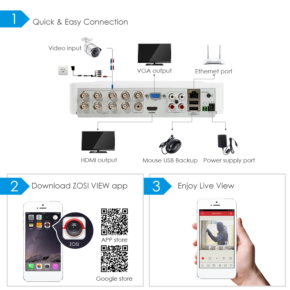 1. Подключите камеру и видеорегистратор, включите их и подключите видеорегистратор к сети. 2. Скачать бесплатное приложение ZOSI Smart. 3. Отсканируйте qr-код для просмотра в реальном времени.