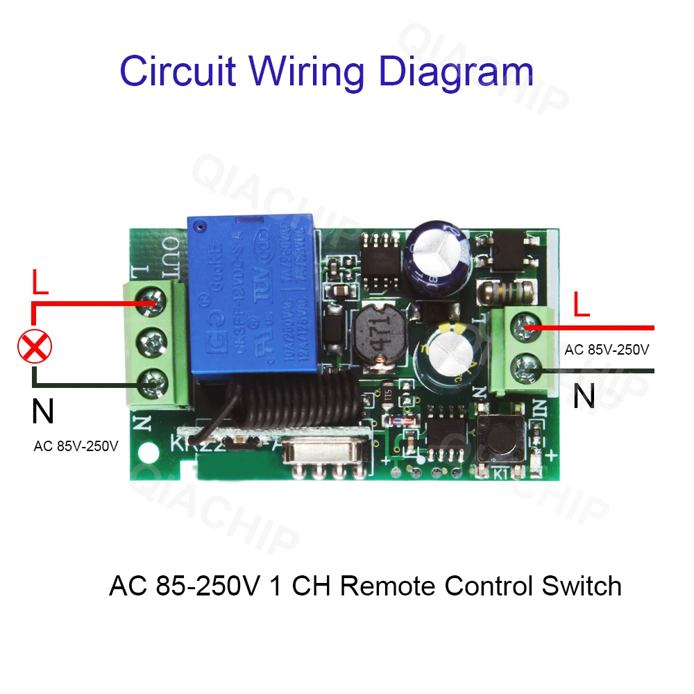 Дважды нажмите кнопку обучения на приемнике, он перейдет в режим настройки переключения. Подождите немного светодиодный погаснет, он переходит в режим обучения. Нажмите кнопку дистанционного управления, светодиодный индикатор на плате приемника начнет мигать, а затем погаснет. Через 3 секунды светодиодный индикатор снова загорится, обучение прошло успешно.