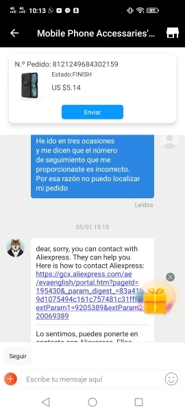 Pesimo service, товар не прибыл, я заказал его из Южной Америки, Калифорнии, продавец не предоставляет вам номер доставки, поэтому вы не можете потребовать его на почтовой почте. Просто повторите снова и снова, что вы идете проверить его в почтовом отделении, и там вам говорят, что номер не действителен. В приложении указано, что ваш заказ был доставлен и ко мне в любое время мне что-то дали, Это афера и AliExpress не дает вам возврат средств. Я не рекомендую его, если вы не хотите тратить свои деньги, не просите этого продавца. Вы никогда не сможете отследить свой заказ, вы не знаете, сколько компания доставит его вам, у вас нет даты доставки, продавец быстро ответил, пока не открылся спор, и AliExpress не предлагает вернуть вам деньги, несмотря на то, что увидено. Я не рекомендую его, очень плохое обслуживание.