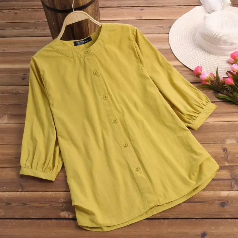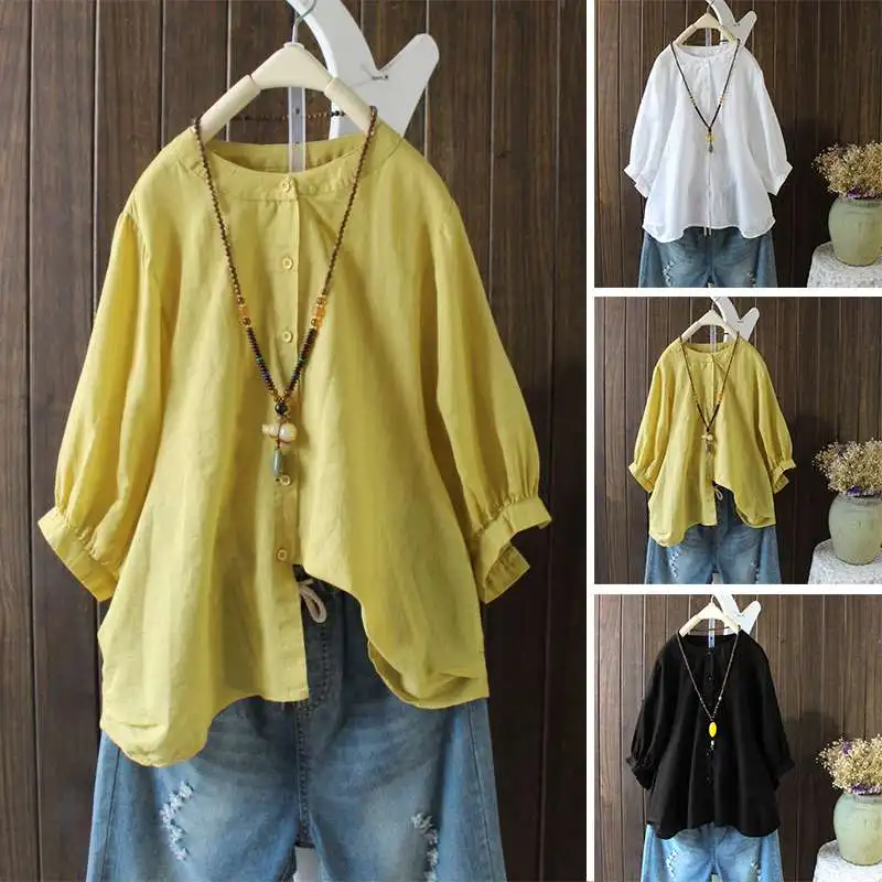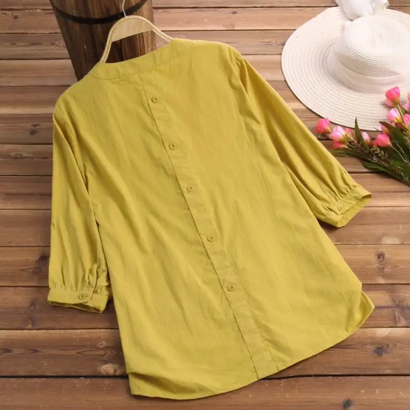 Женская Повседневная летняя Однотонная рубашка из хлопка и льна с рукавом 34, свободная рубашка на пуговицах, винтажная туника, женские топы