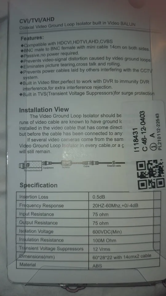 100% новый и высокое качествоПассивный, не требуется питание.Предотвращает искажение видео-сигнала, вызванное петлями заземления видео.Устраняет разрывы изображения, перекрестный разговор и прокатку.Предотвращает прокладку кабелей питания другими устройствами, препятствующими работе системы видеонаблюдения.Потеря вставки: 0,5 дБЧастотная характеристика: 20 Гц-10 МГц (0 ~ 3 дБ)Сопротивление коаксиального входа/выхода: 75 ОмИзоляция земли: более 90 дБ больше 50 ГцНапряжение изоляции: 600 В постоянного тока (мин)Сопротивление изоляции: 100 м ОмПодавители переходных напряжений: 12 VrmsРазмеры: 68x28x21 мм с 24 смЦвет: черныйМатериал: пластик, металлПосылка включает в себя:1 x BNC видео заземления петли изолятор1 Инструкция по установке на английском языкеПримечание: светильник и различные дисплеи могут привести к тому, что цвет товара на картинке немного отличается от реального. Допускается погрешность в измерениях +/- 1-3 см.