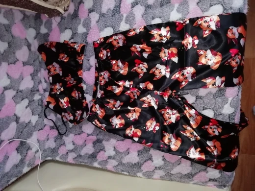 Очень милая пижамка! Мягкая, приятно носить и прикасаться. На российский 40 размер подошло хорошо, но верх немного широковато по бокам. Единственное, собака своими когтями цепляет и остаются зацепки, которые не убираются и остаются белыми полосками. Доставка быстрая, трек отслеживался, с продавцом не общалась