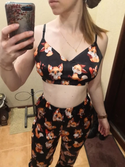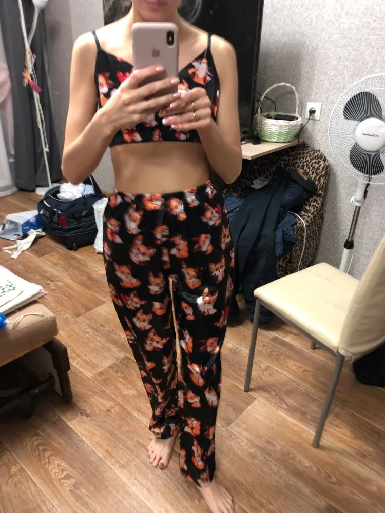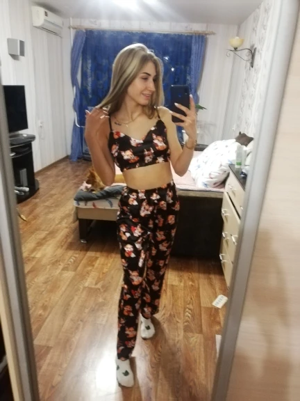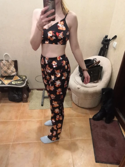 Отличная пижама. брюки свободные, а топ чуть стянут резинкой. жене понравилось
