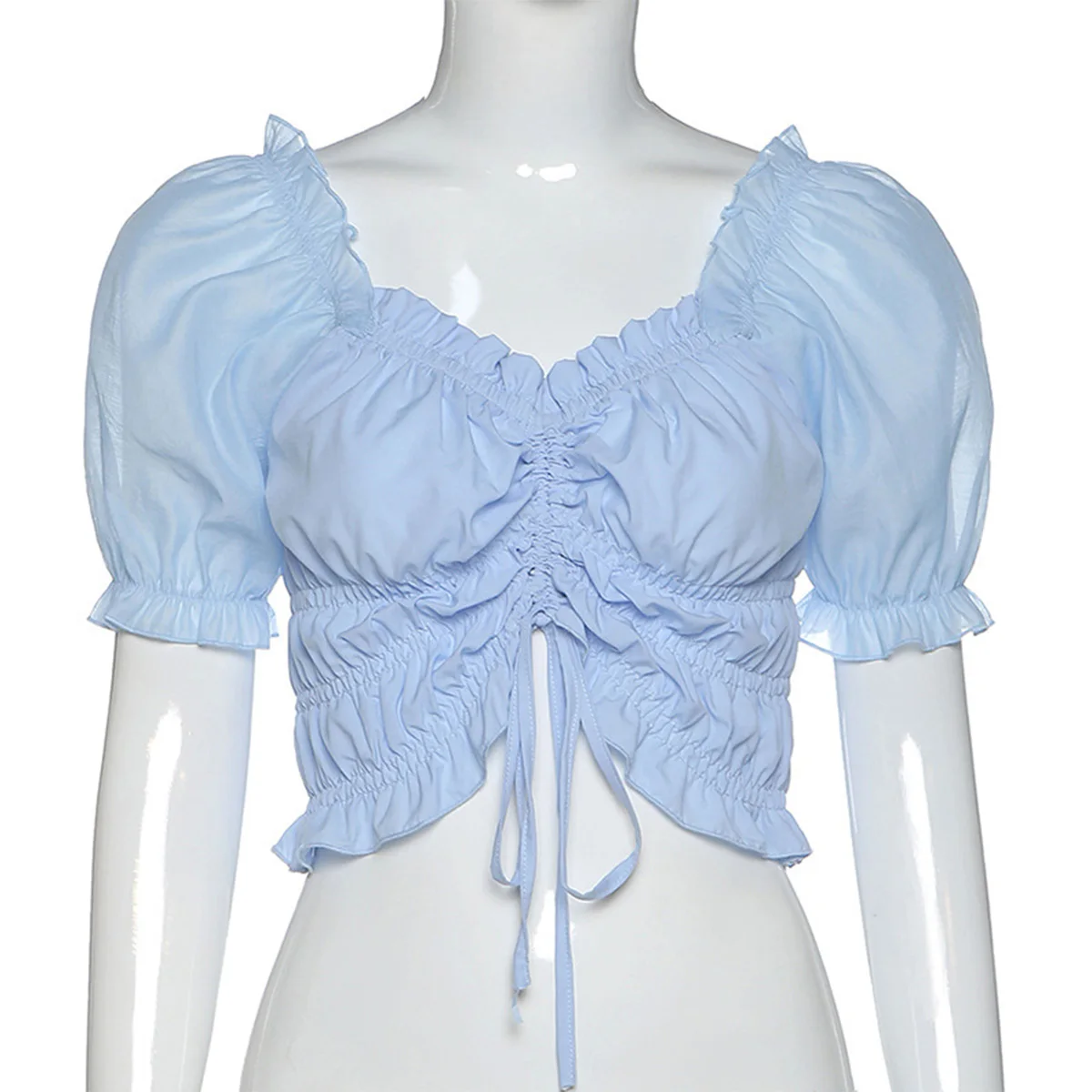 Женские винтажные блузки с пышными рукавами, коротким рукавом, V-об...