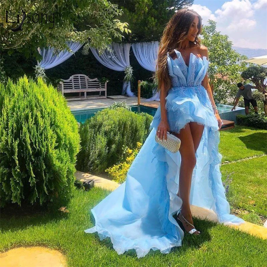 Длинные платья для выпускного, небесно-голубого цвета, с оборками, бисером, с открытыми плечами, с перьями, для официальной вечеринки, 2020