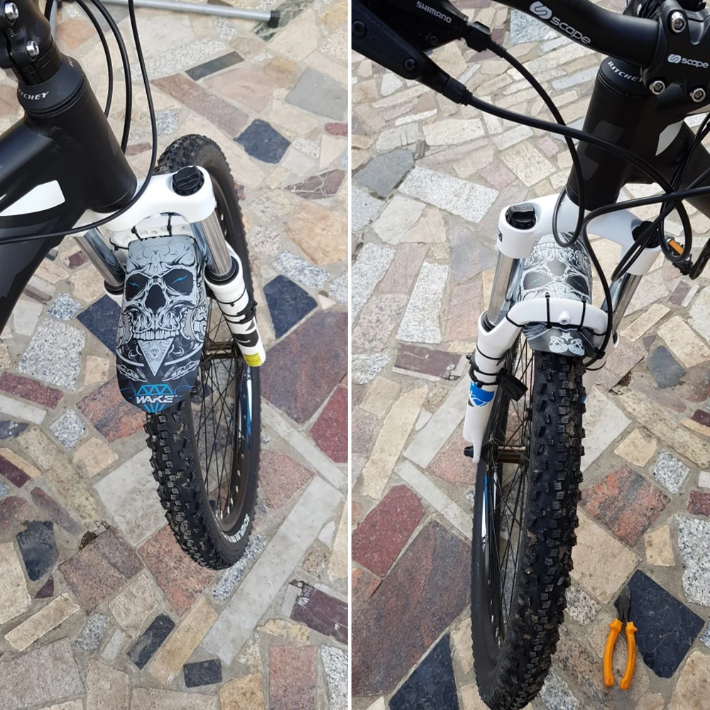 Он имеет лучшую форму для захвата грязи и пыли, и 6 подходящих кабельные стяжки должны быть использованы для прикрепления их к подвеске передней и задней вилок велосипеда. Эффективно предотвращает брызги воды и грязи.
