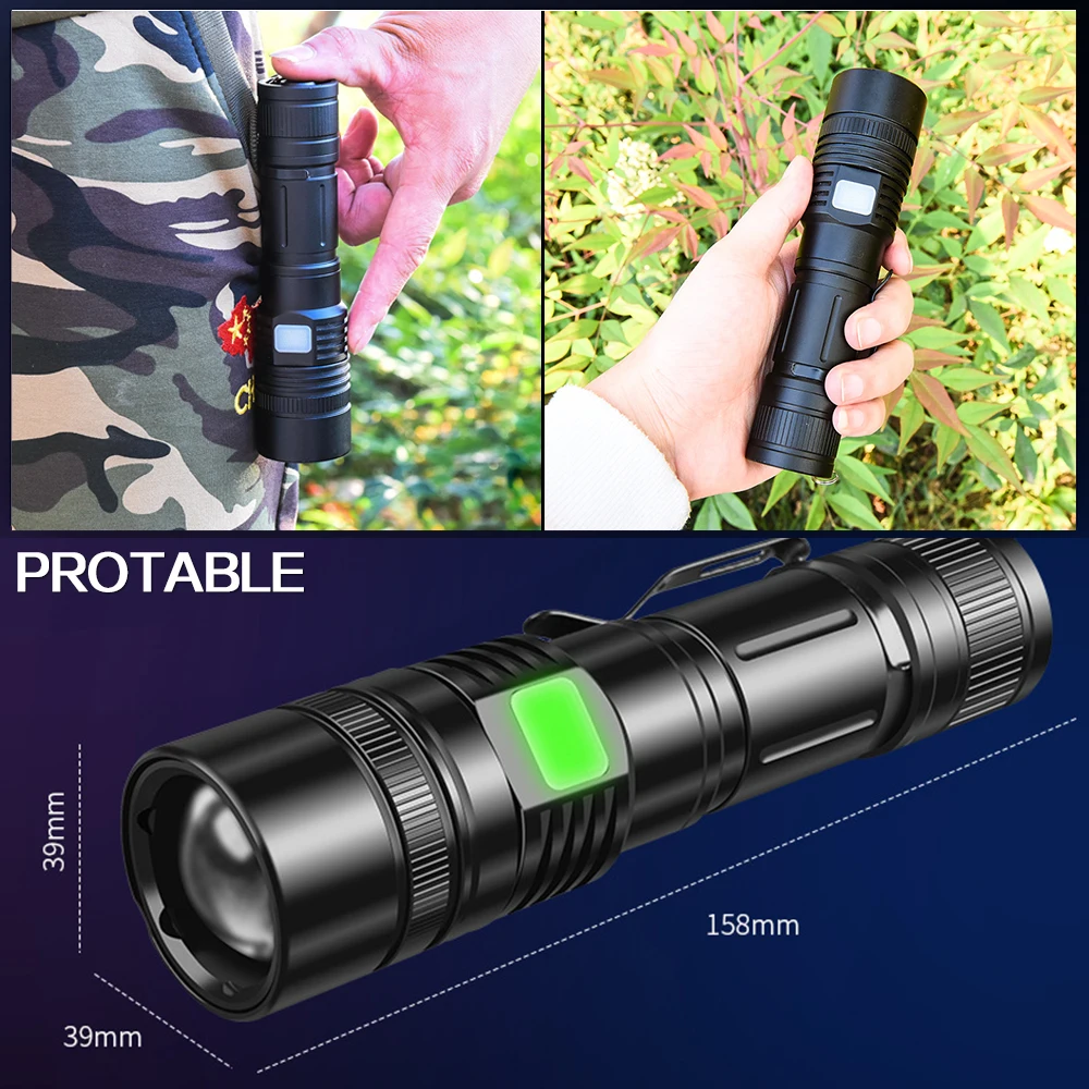 Концепция дизайна:Мощный светодиодный фонарикУвеличьте 1*18650 или 1*26650 аккумуляторный отсек, чтобы увеличить время работы.Дисплей емкости аккумулятора, телескопический зумМикро-usb для компьютера usb, Автомобильный USB, usb-разъем для зарядки, зарядный фонарикИзготовлен из авиационного алюминиевого сплава прочный HAIII военный класс Жесткий анодированныйВодонепроницаемый в соответствии с IPX-5, водостойкий, может использоваться в дождливую погоду, но не может положить его в водуПодходит для работы, охоты, альпинизма, рыбалки, кемпинга и активного отдыха и т. д.Ударопрочный до 2 метров.