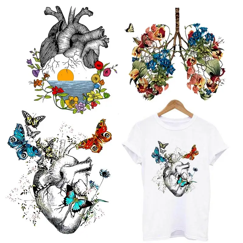 Модные термо-наклейки для одежды с цветочными бабочками и сердечками, наклейки с аппликацией из человеческих органов, железные переводные наклейки для одежды