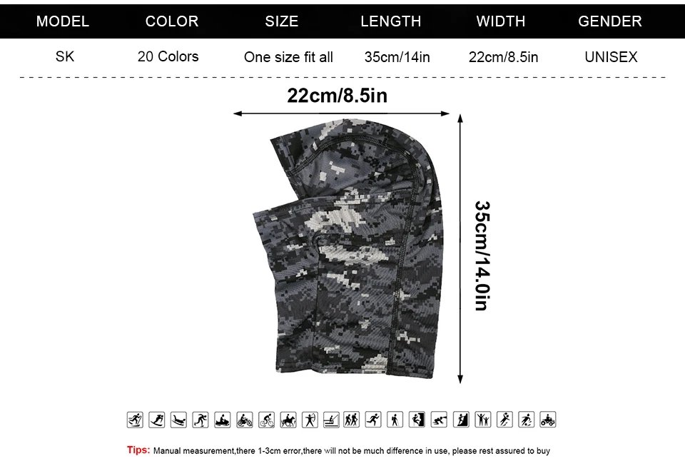 2.Дышащая особенность: тонкий дизайн, плотно прилегает к вашей коже и может свободно дышать. Помогает уменьшить запотевание шлемом. Можно носить самостоятельно или под любым видом шлема. Тактическая Балаклава защищает вашу голову от пыли, солнца или снега.