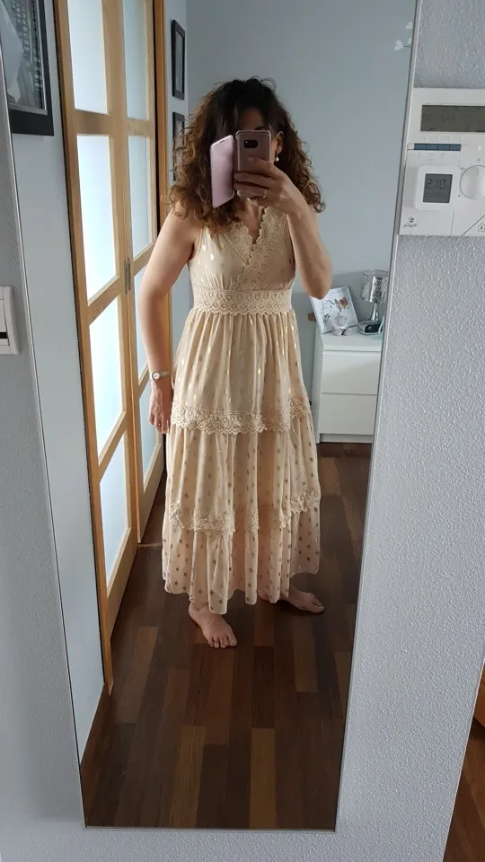 Платье очень хорошо сделано. Толстый и хлопковый материал. Милый Бежевый цвет. Приблизительный размер