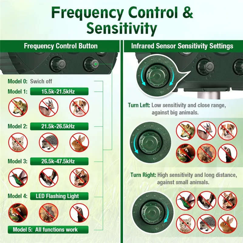 Описание:Садовый Солнечный ультразвуковой отпугиватель животных датчик движения Активированный Сова Форма Водонепроницаемый репеллент контроллера вредителейСолнечная энергия и водонепроницаемость: заряжается от солнечной энергии на солнце или через USB источник питания в дождливую погоду. Уровень IPX4 водонепроницаемый, что позволяет отгонять украденных животных в любое время в любом месте экономично и удобно.Ультразвуковой и мигающий светодиодный: отпугивает и устраняет неприятных животных или вредителей, излучая мощную ультразвуковую волну и сильный светодиодный мигающий светильник, вдали от наших ферм, садов, садов, лужаек и передних дворов.Большая защита покрытия: конструкция с двумя динамиками с увеличенной степенью для излучения звуковой волны, акустическое покрытие до 5000кв. Футов. До тех пор, пока животные близки к 30 футов отпугиватель животных ультразвуковой будет активирован датчиком движения.Простота установки и использования: Просто вставьте отпугиватель животных на солнечных батареях ультразвуковой в грунт или повесьте там, где есть солнечный светильник, и включите его. Тогда вы можете иметь окружающую среду без животных.Экологичность: Нет смерти животных и Нет химической стимуляции, просто отпугивайте животных, это самый гуманный подход. Вы можете использовать отпугиватель животных на солнечных батареях для кошек, собак, кроликов, птиц, оленей, белок, енотов, волов и т. д.Спецификация:Материалы: АБС-пластикПокрытие: 30 Feets @ 180 ° = 5000 квадратных FeetsРазмер: 350 мм x 150 ммВес: 450 гАккумулятор: 3 AA (в комплекте)Примечание:1. Держитесь подальше от детей, не рассматривайте это как детскую игрушку, хотя она выглядит мило2. Когда он используется в первый раз, пожалуйста, полностью зарядите его, чтобы обеспечить его использование3. Пожалуйста, Оторвите верхний слой солнечной защиты и поместите Солнечный драйвер животного в солнечное место, может работать для вас плавно.4. Пожалуйста, установите направление датчика животного в направлении животных,Убедившись, что они не боятся подходить5. Было бы лучше сбросить частоту время от времени, в случаях, когда животные привыкают к этому ..Ультразвуковая частота:0Скидка1: 13,5 кГц-19,5 кГцМыши, крысы, собаки, лисы, Мартенс и т. Д.2: 19,5 кГц 24,5 кГцКошки, еноты, Барсуки, скунки и т. Д.3: 24,5 кГц 45,5 кГцЛетучие мыши, птицы, грызуны и т. Д.4: сильные мигающие огниЕнот, кабана, Мартен и т. Д.5: переменная частота и сильный светодиодный мигающий светВсе животныеПосылка включает в себя:1 x Отпугиватель Животных на солнечных батареях1 х USB кабель2 x Съемная фиксирующая трубка