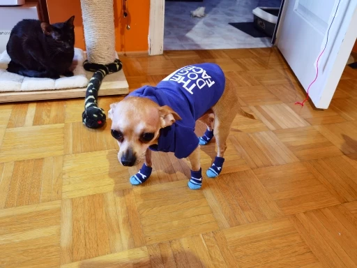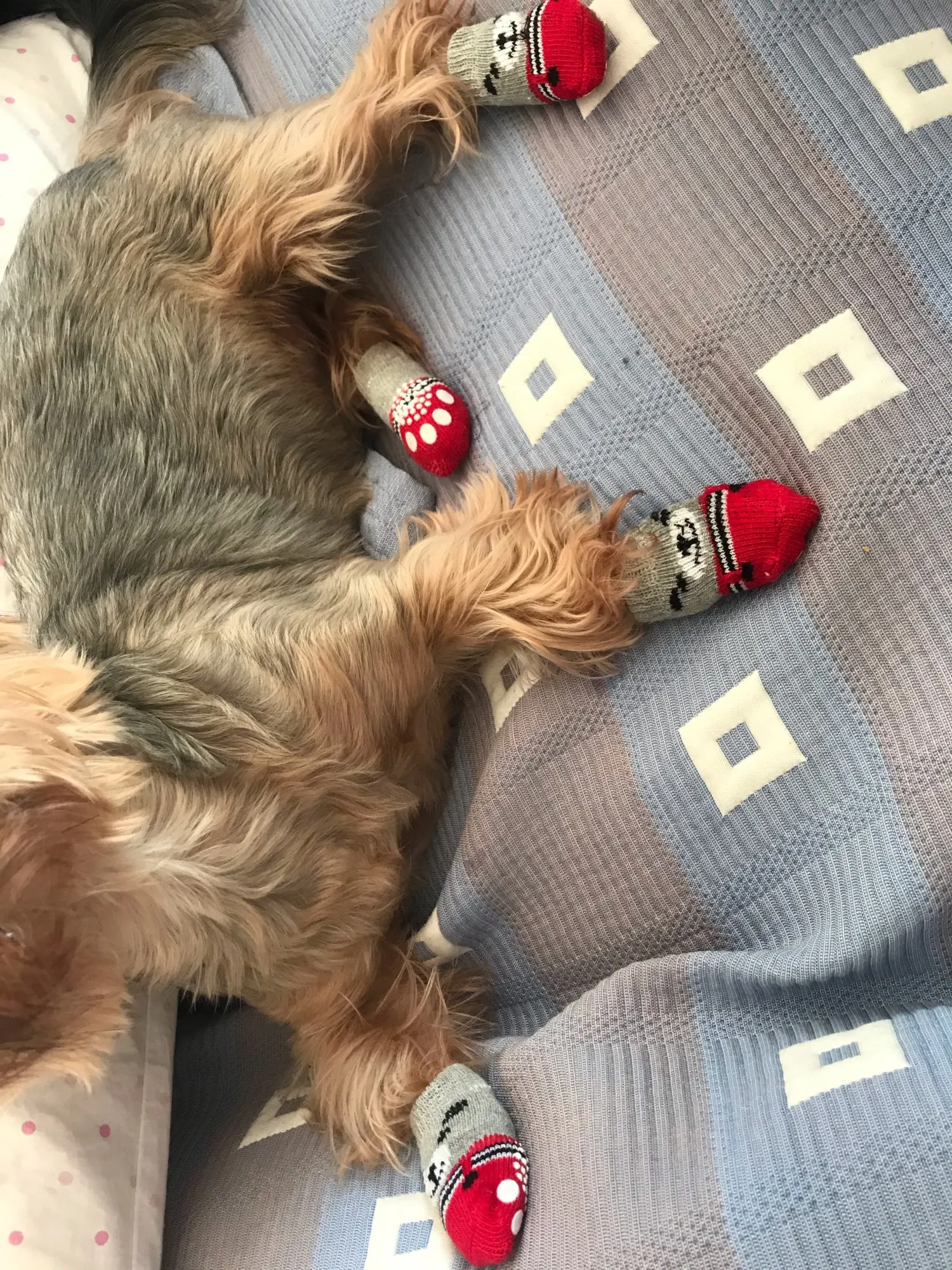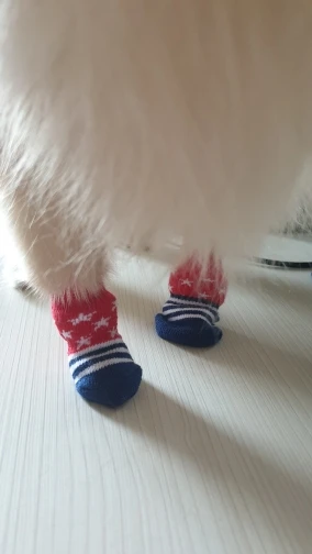 Костюм наш, но носочки с ним сидят очень хорошо и красиво) Носки не очень плотные и немного сползают, так как нет завязок, но для первого раза, чтобы собака привыкла, самое то. Нитки не торчат, цвет яркий, на подошве хорошее уплотнение от скольжения. Продавца рекомендую) спасибо