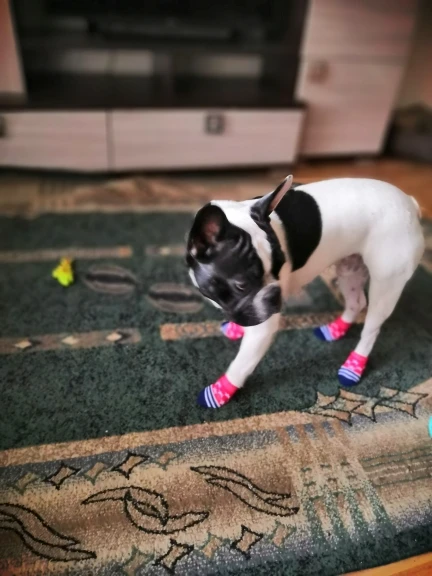 У нас два мопса: чёрному 2,5 года - 10,5 кг и светлоту 8 месяцев - 6 кг. Был опыт, брали у другого магазина старшему носки «с запасом», так вот они и слетали постоянно, даже когда совсем вырос. Здесь же взяли на пробу один набор, чтоб если что - не жалко) и вот они отлично подошли обоим. Рекомендую, своим закажем ещё.