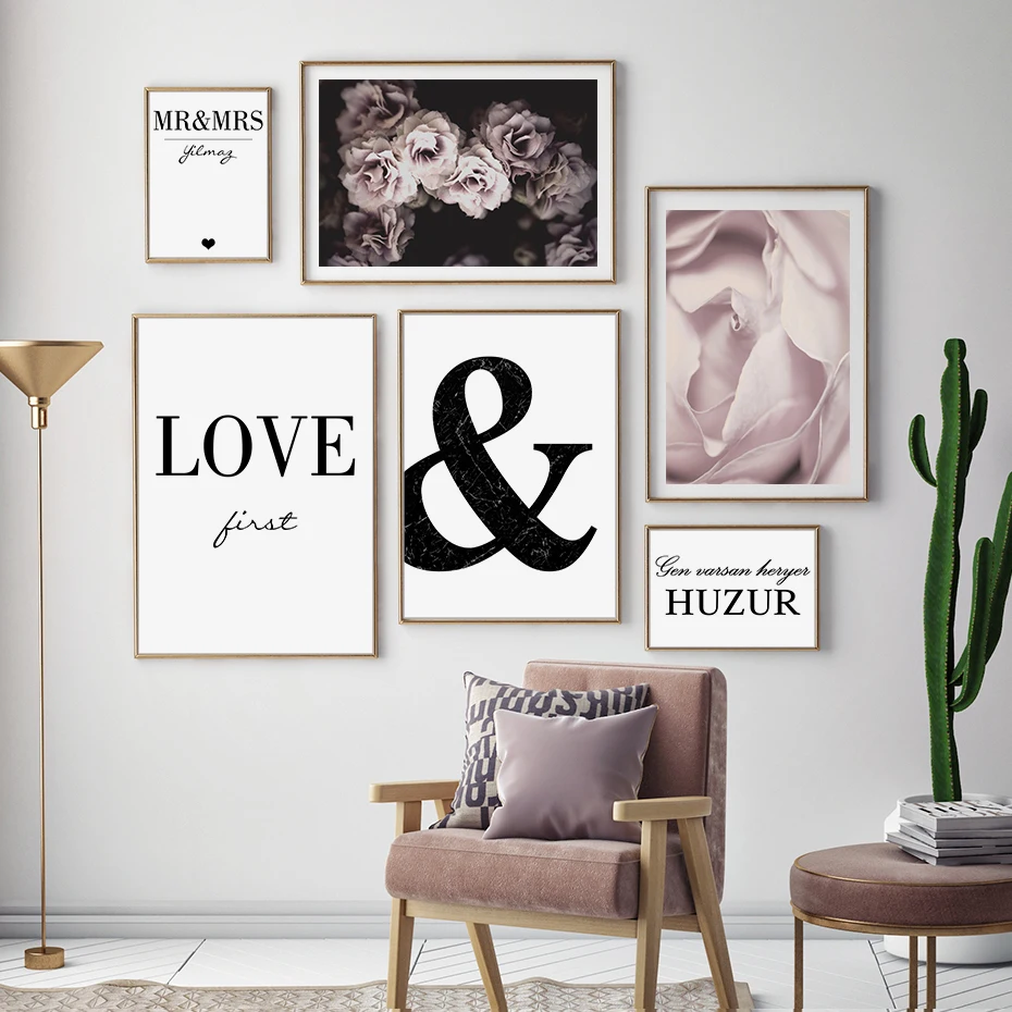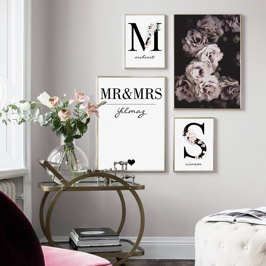 Картина на холсте, с принтом розовых цветов, начальное имя на заказ, абстрактная картина, настенный плакат, картины для украшения гостиной, дома