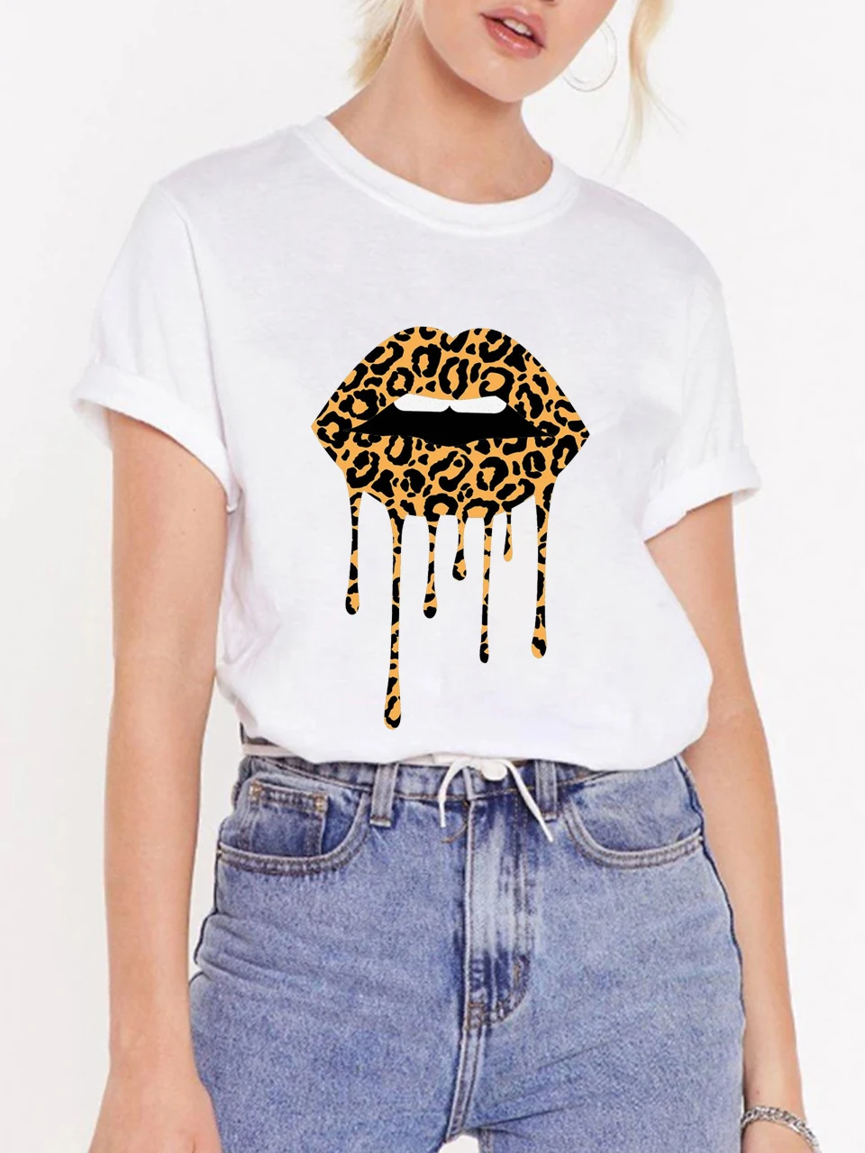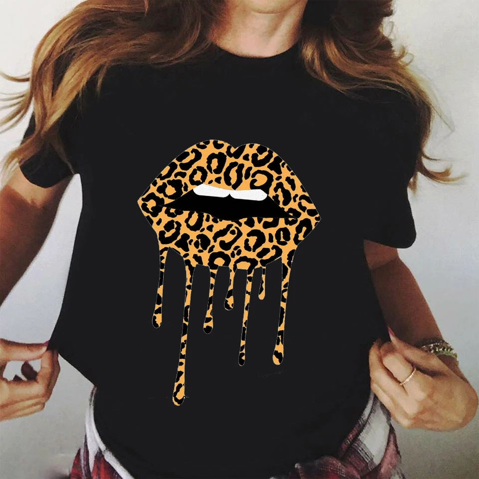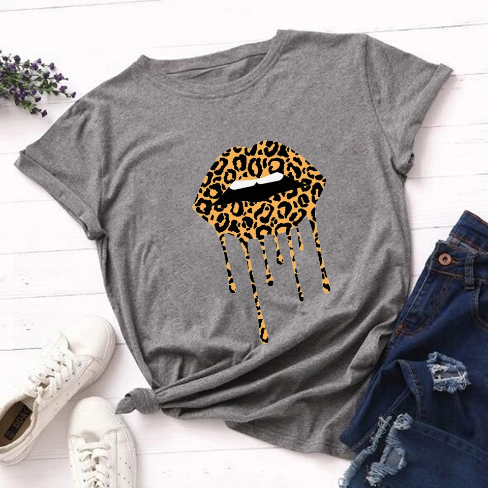 Женская одежда, футболка с леопардовым принтом губ, футболка с коротким рукавом, Harajuku, женские эстетические футболки, Ulzzang, топы, повседневные женские футболки