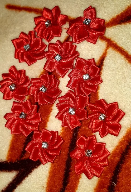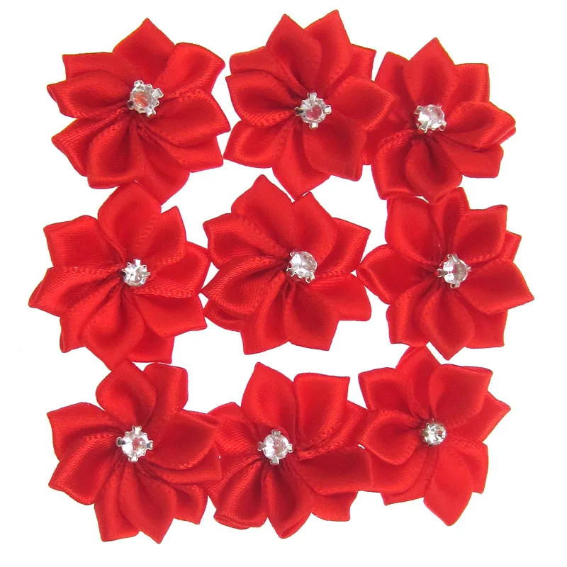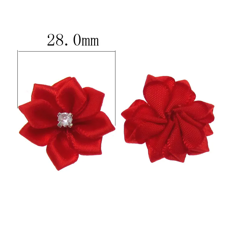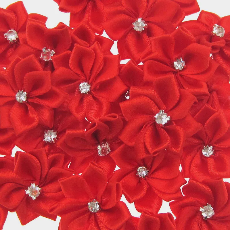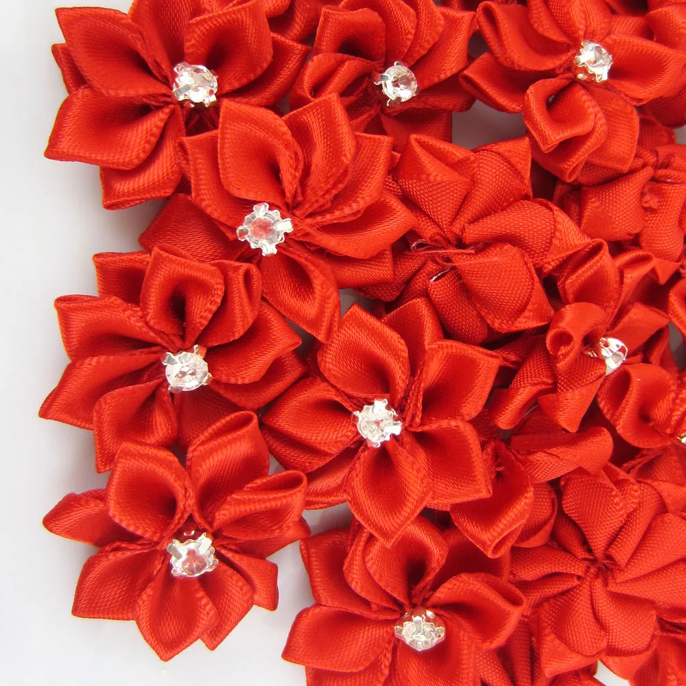 Искусственные цветы из красной атласной ленты, 12 шт., 1 дюйм, белые стразы, аппликации, банты с цветами для рукоделия, шитья, свадебного украшения