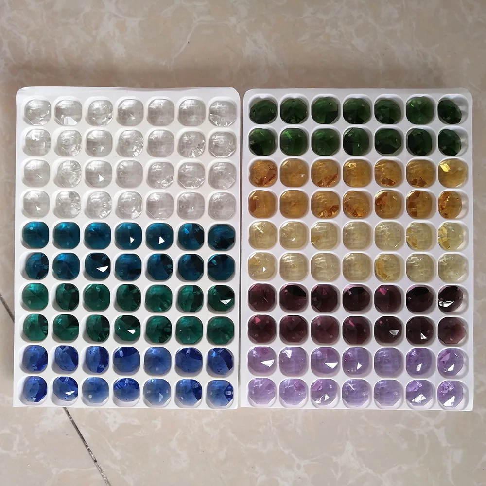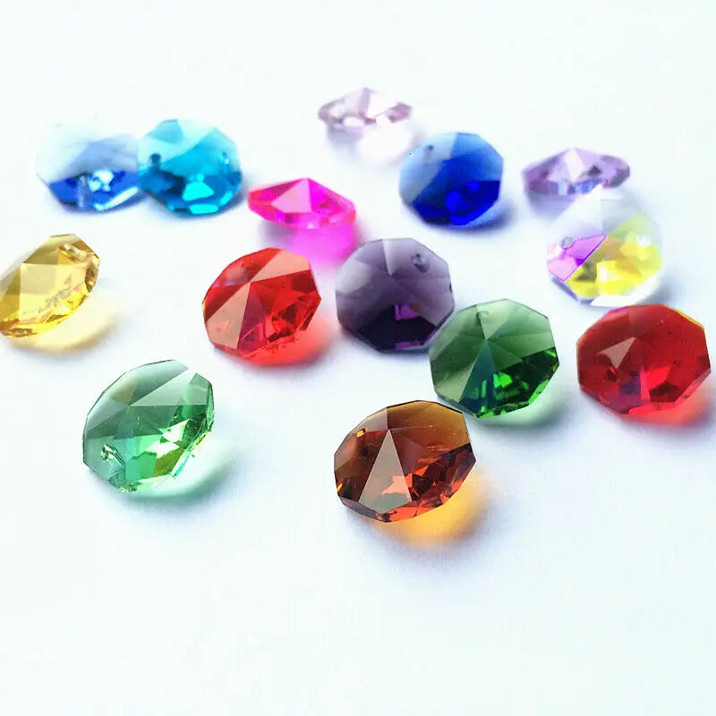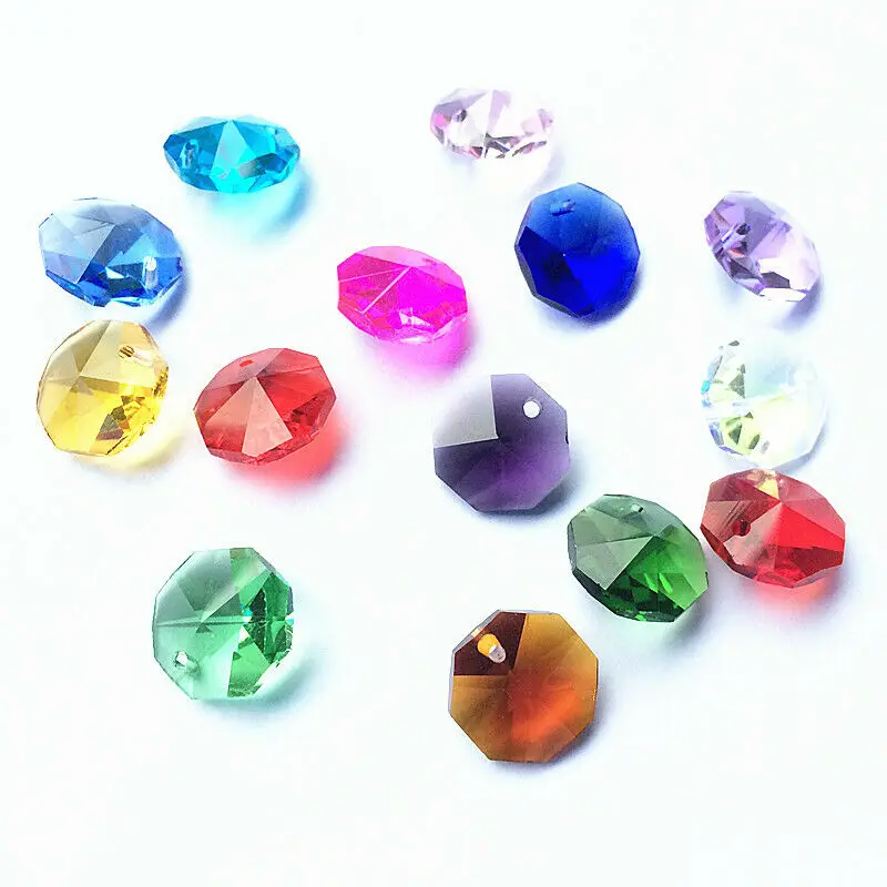 Название: разноцветные стеклянные Восьмиугольные бусины Размеры: 14 мм Материал: Хрустальное стекло K9 Отверстие: 1 отверстие/2 отверстия Цвет s: цвет ful (случайный цвет) Кол-во в коробке: 100 шт./лот Использование: украшение дома, подвешивание окон, Ловца солнца, детали люстры