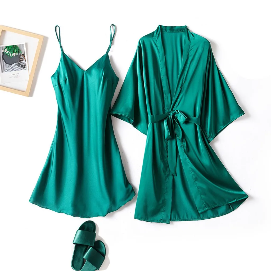 Упаковка: 1 комплект атласных пижам с кружевом (1 халат, 1 Ночная рубашка)
