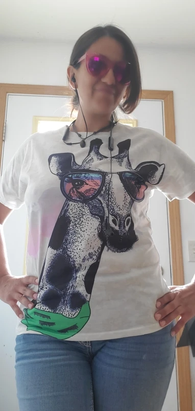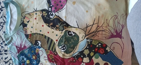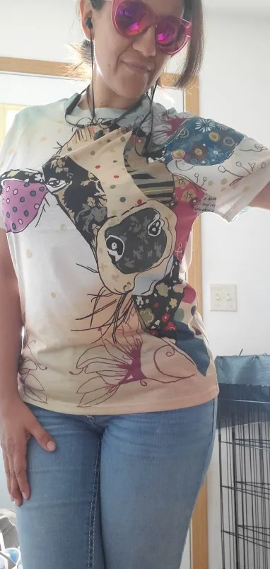 Отличная рубашка, цвета как на фото. Это полиэстер. Я купил размер S (маленький), это размер, который я всегда покупаю в США, и он подходит мне идеально. В соответствии с таблицей размеров для измерений в см, что предлагает продавец. У этого жирафа есть Женская порез, которая выделяет фигуру. Дизайн коровы не имеет такой же кроя, он прямой, но тоже симпатичный.