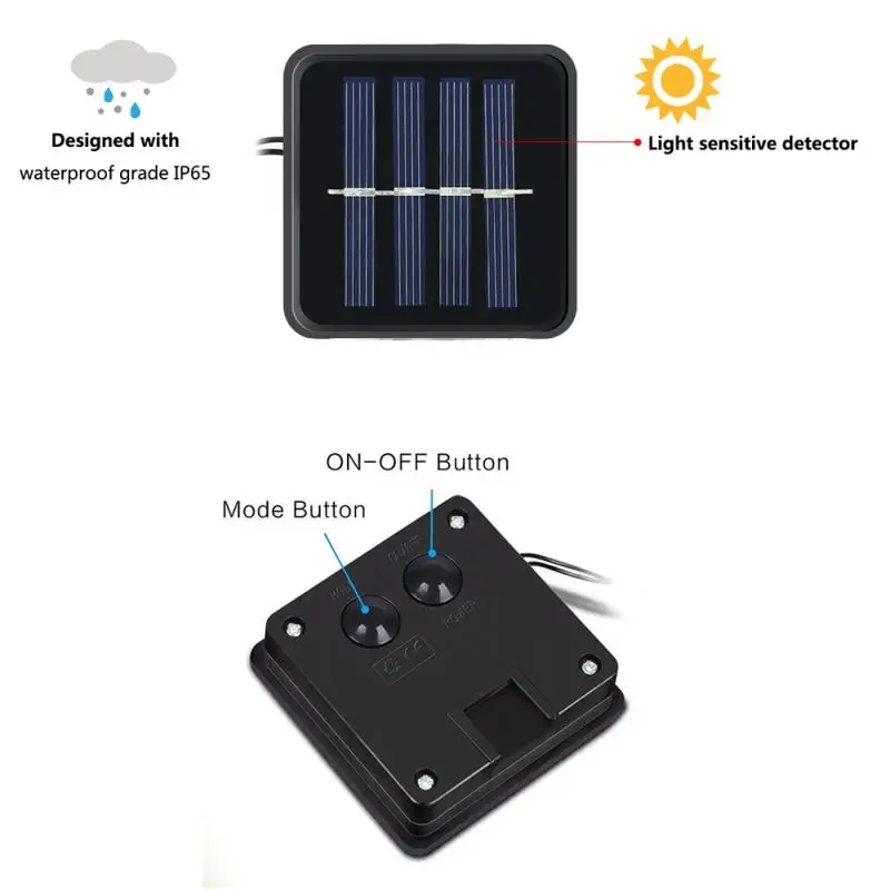 Простота в использовании-солнечная панель легко устанавливается. Эти огни автоматически включаются в темноте и автоматически выключаются в яркости. Двойные кнопки питания и режима находятся на задней панели для управления. Только «ВКЛ./ВЫКЛ.» регулируется на «ВКЛ.» состояние, гирлянды могут заряжаться.