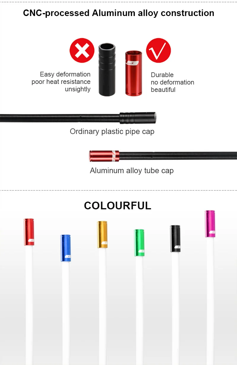 Бренд: GUB Цвет: черный/красный/синий/золотой/зеленый/фиолетовый (по желанию) Диаметр: 4 мм/5 мм (опционально) Подходит для: тросов переключения передач 4 мм/тормозных тросов 5 мм Материал: алюминиевый сплав