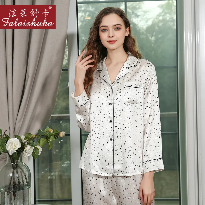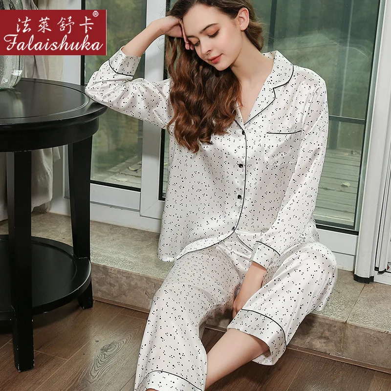 19 momme 100% натуральной шелковой пижамы наборы для женщин, одежда для сна в Корейском стиле белые туфли в горошек элегантные чистого натурального шелка женские пижамы T8261