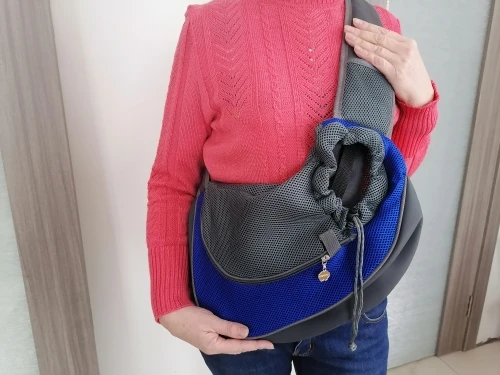Сумка очень удобная, качественная, выглядит отлично! Для среднего размера чихуахуа (2.100 кг и 30 см по спинке) выбрала размер L, чтобы зимой поместился в одеяльце или толстом комбинезоне. Удобно носить и через плечо, и на одно плечо.