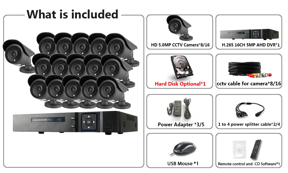 Система видеонаблюдения, 16 каналов, HDMI, 5 МП, DVR, 16x1000TVL IP66