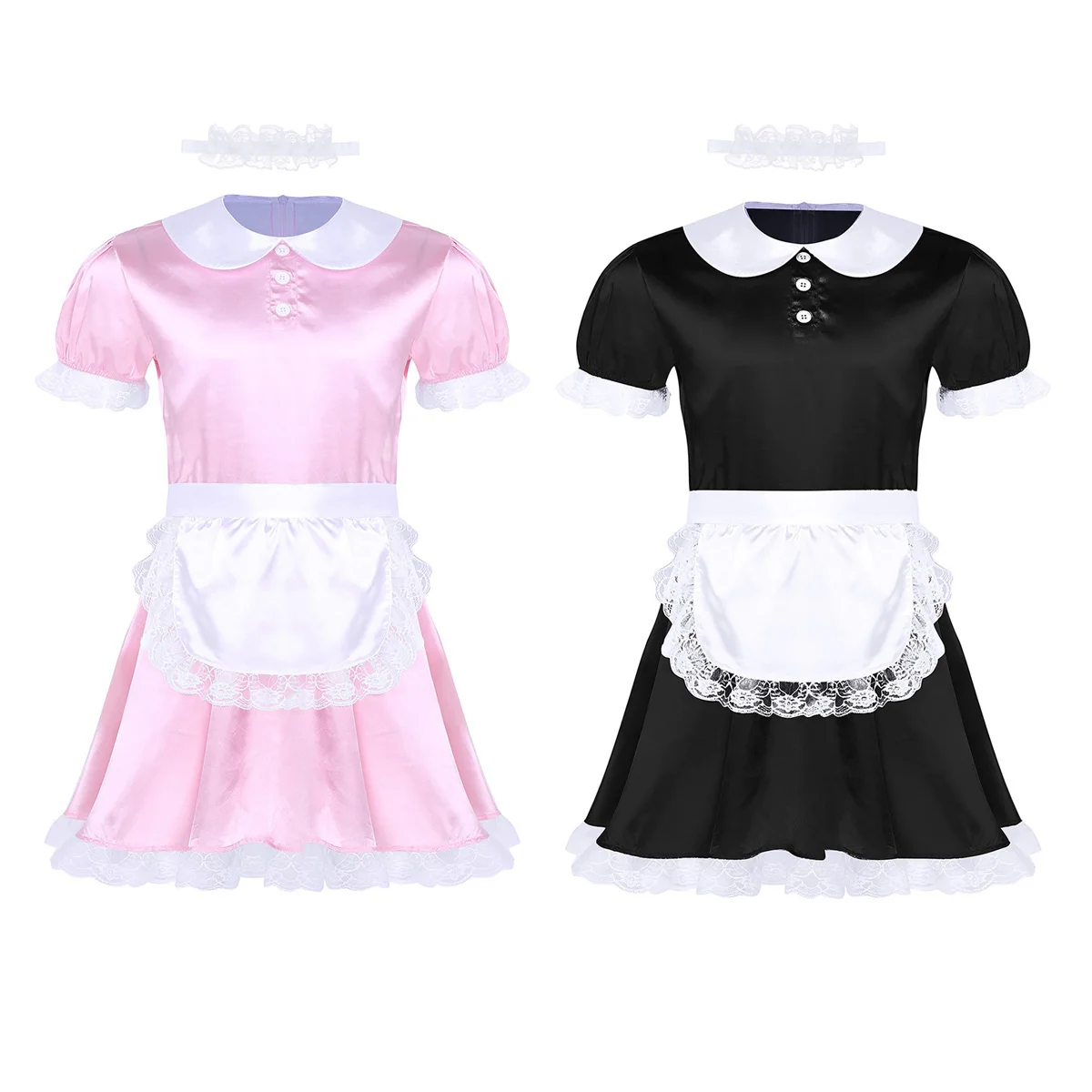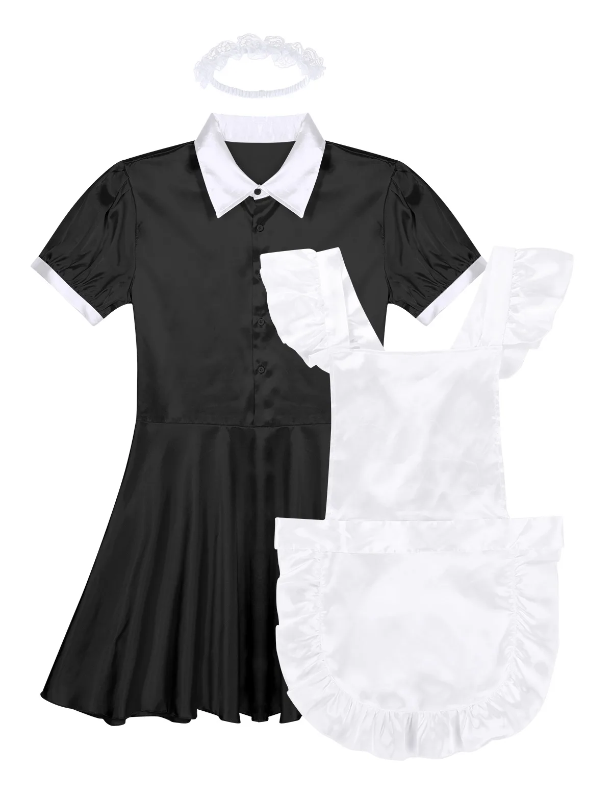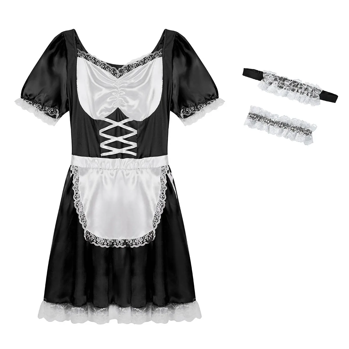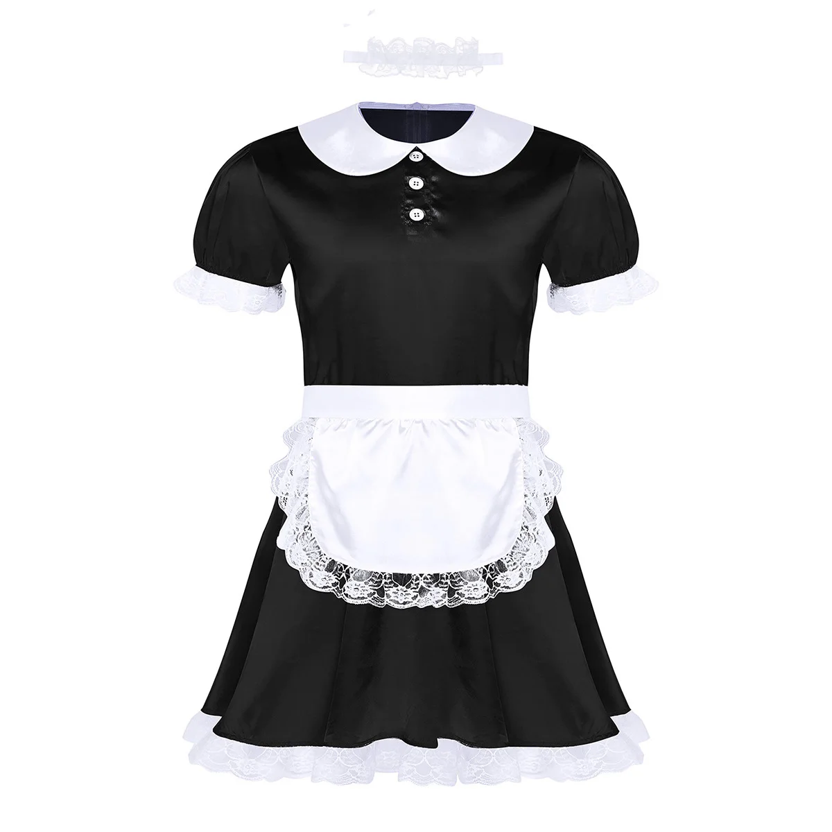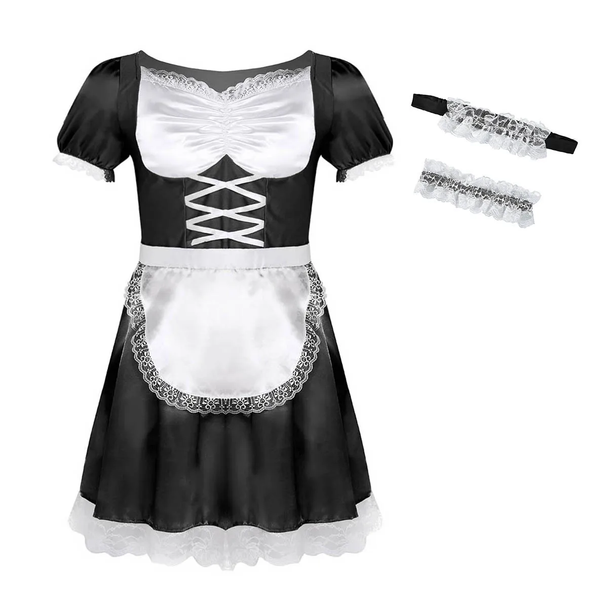 Костюм горничной из 3 предметов для женщин, атласное платье с повязкой на голову и фартуком, с коротким рукавом и кукольным воротником, для ролевых игр