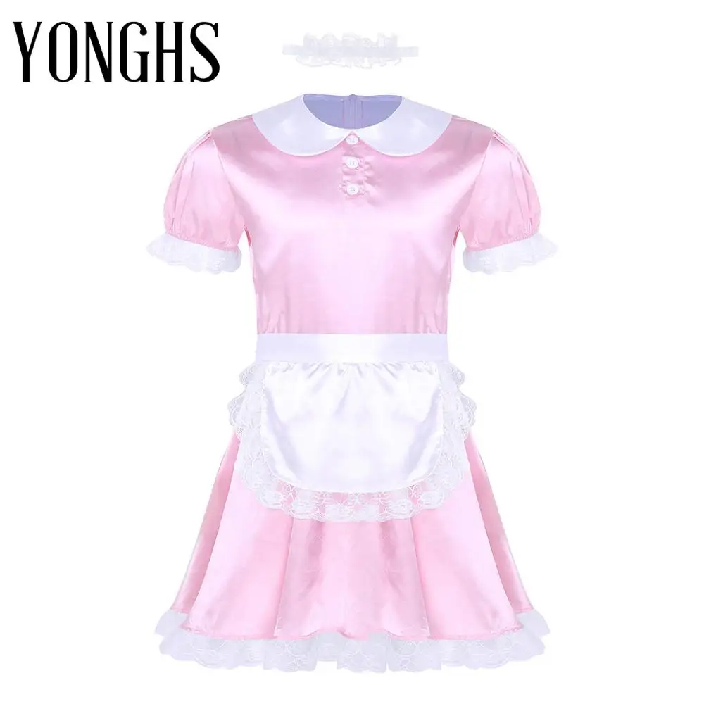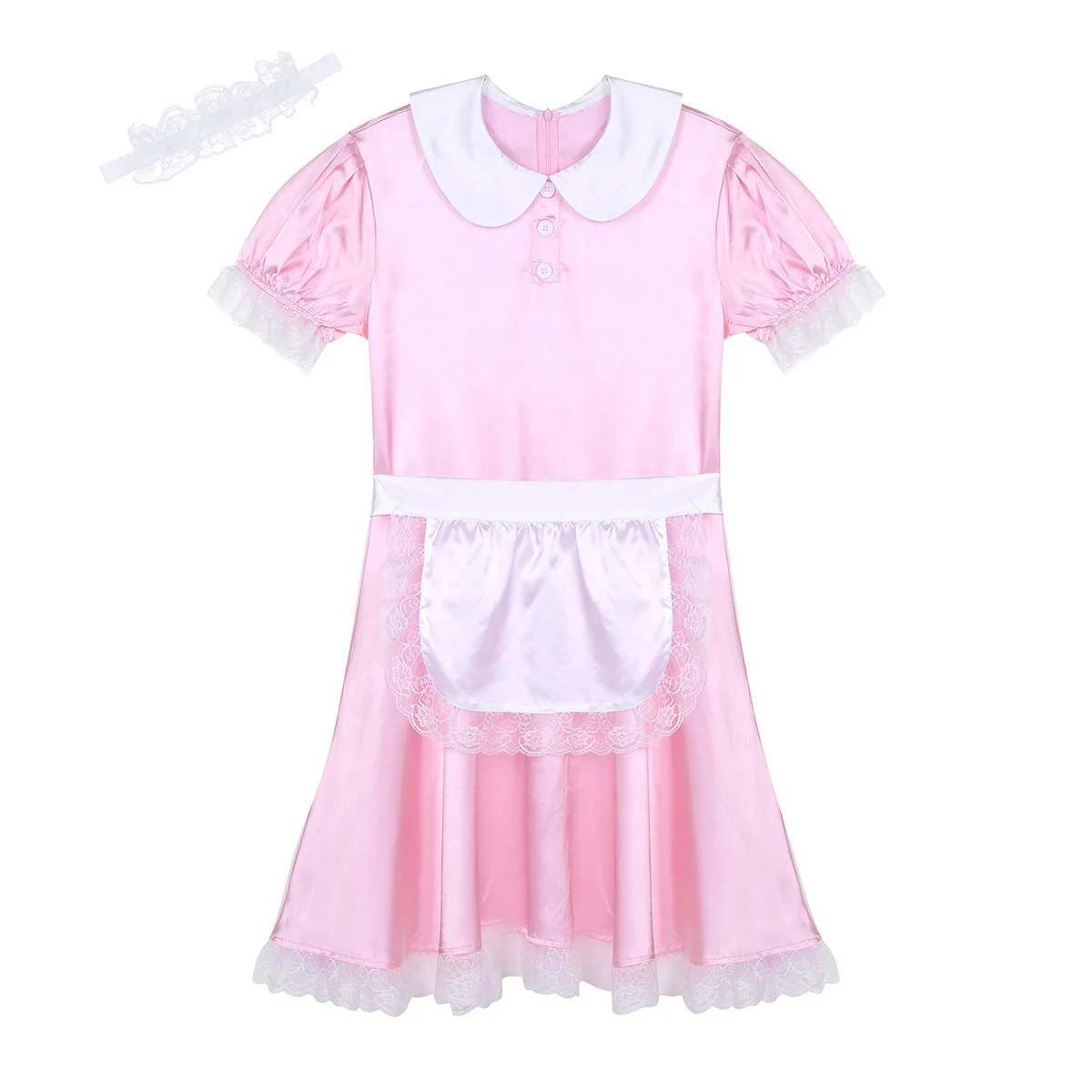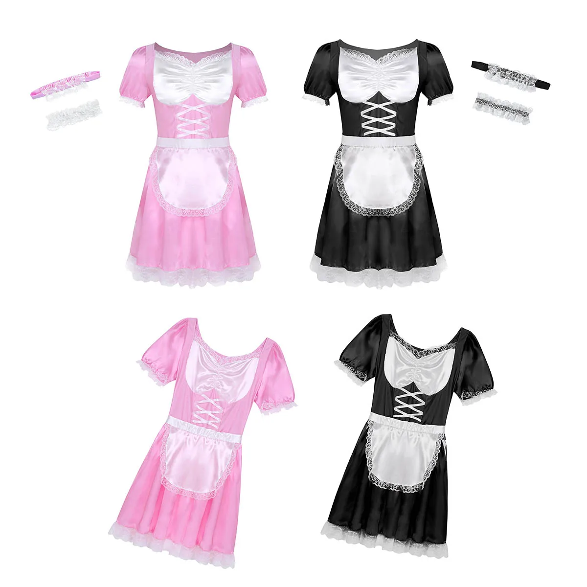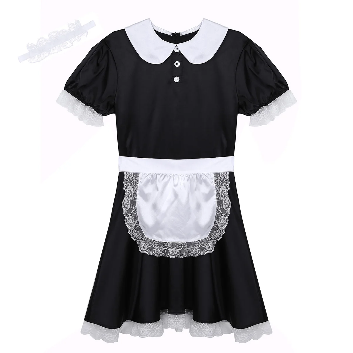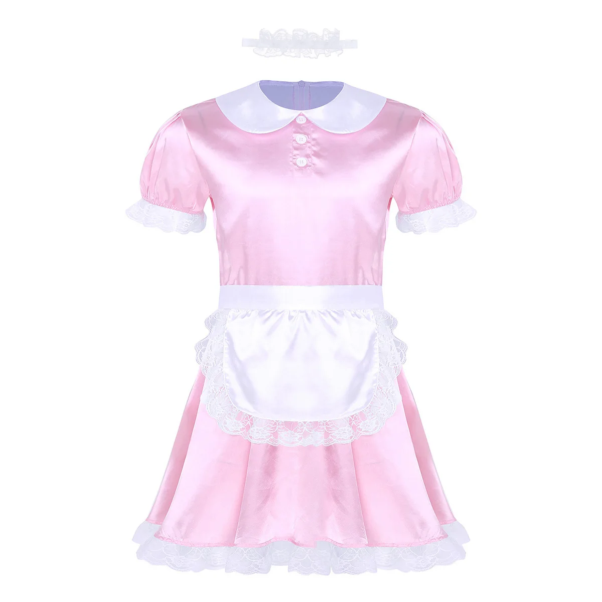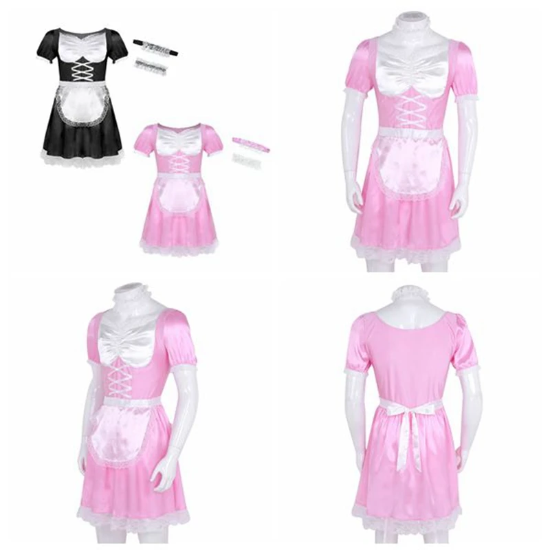 Костюм горничной из 3 предметов для женщин, атласное платье с повязкой на голову и фартуком, с коротким рукавом и кукольным воротником, для ролевых игр