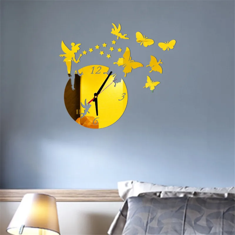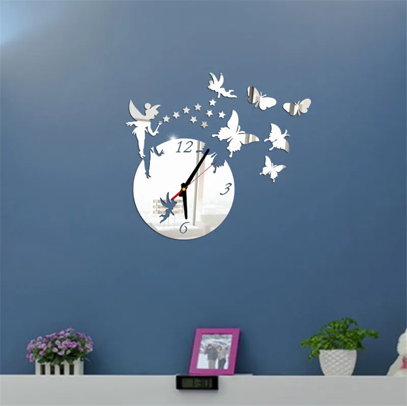 Акриловые зеркальные наклейки, настенные часы, современный дизайн, Сказочная бабочка, 3D самодельные часы для девочек, подарок для гостиной, домашний декор