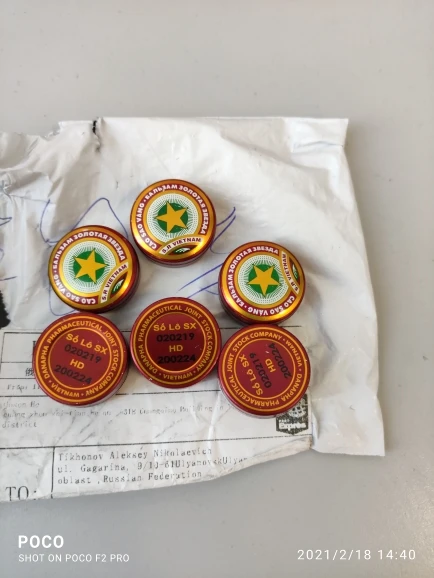 Шло больше месяца. В комплекте коробочка и инструкция на вьетнамском языке. Баночка заполнена наполовину, то ли брак, то ли расплавилась по пути. Инструкцию перевел на русский, кому интересно, см фото ниже. Но лечебные свойства оценить не берусь.